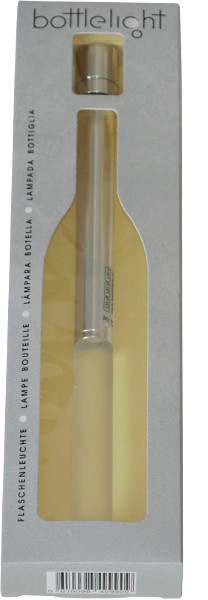 Die Flaschenleuchte Bottlelight ist zur Beleuchtung von leeren Wein- und Champagnerflaschen gedacht und gibt ein angenehmes, großflächiges nicht blendendes Licht in der Flasche ab. Die Flaschenleuchte wird mit drei Standard AA-Batterien (1,5V) oder mit drei wiederaufladbaren NiMH-Zellen betrieben (nicht im Lieferumfang), die bei offenem Deckel einfach eingeschoben werden können.