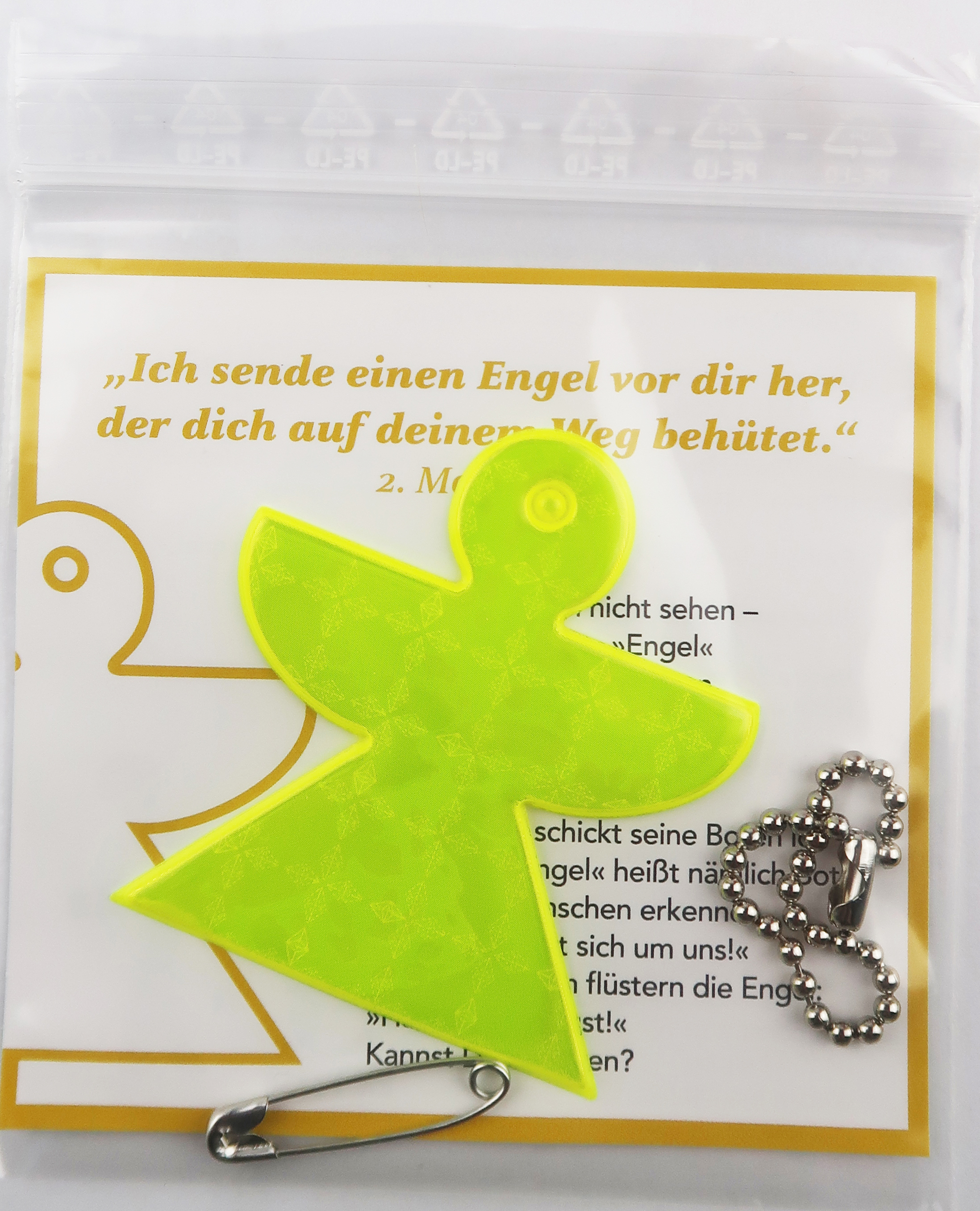 - Lieferumfang: Schutzengel-Reflektor mit Kugelkettchen und Sicherheitsnadel zur individuellen Anbringung