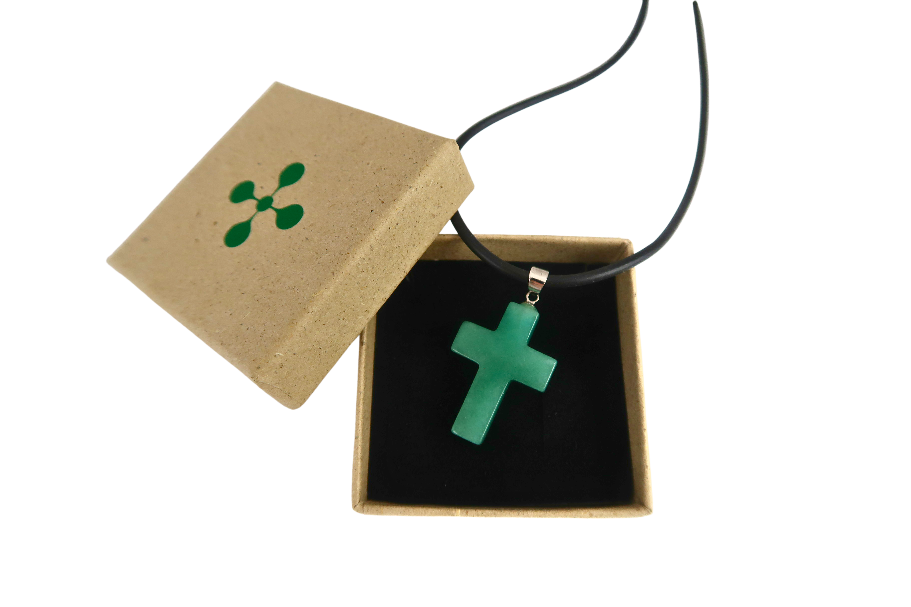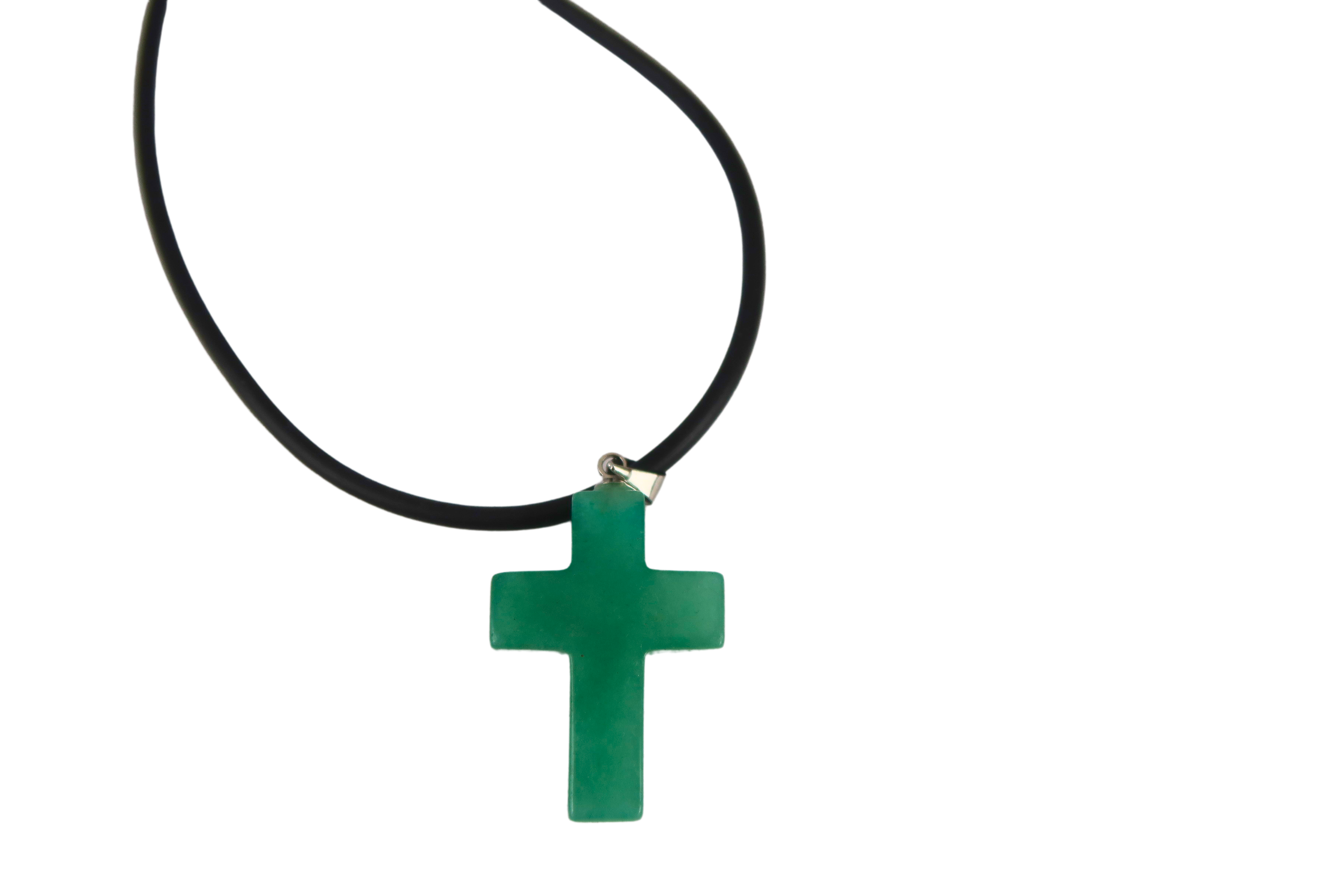 Ein hübsches, schlicht geschliffenes Kreuz aus dem Halbedelstein Aventurin an einer schwarzen Naturkautschuk-Kette (45 cm).