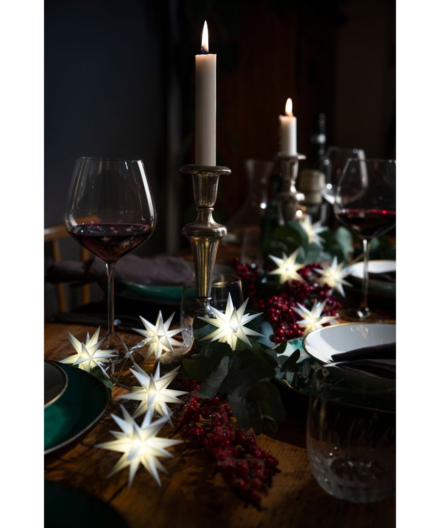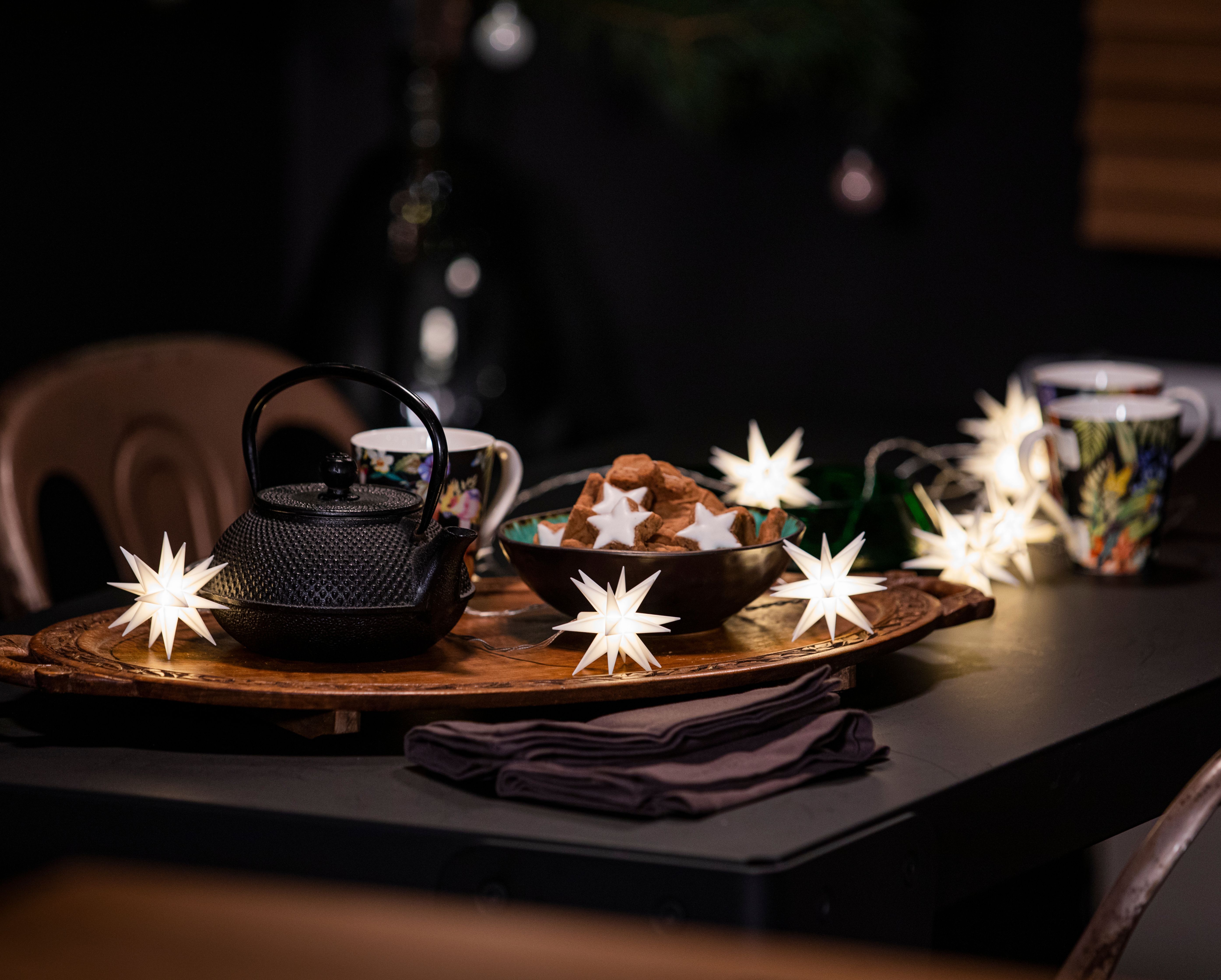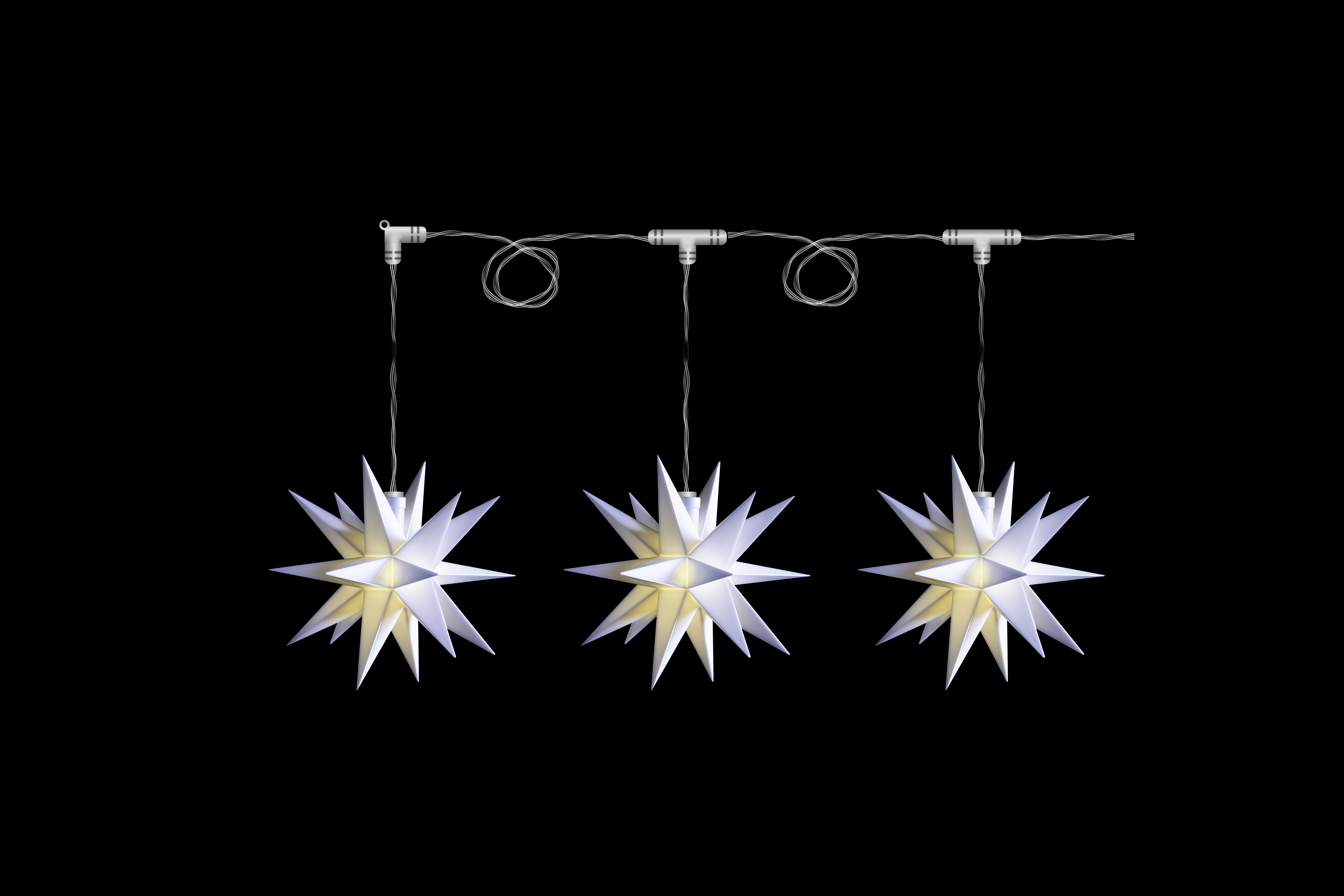 Diese Mini-Sternenkette besteht aus drei kunstvollen Sternen, jeder mit beeindruckenden 18 Zacken und einem Durchmesser von jeweils 12 cm. Sie wurde speziell für den Innenbereich entwickelt und sorgt mit ihrer warmen LED-Leuchte für eine gemütliche Atmosphäre.