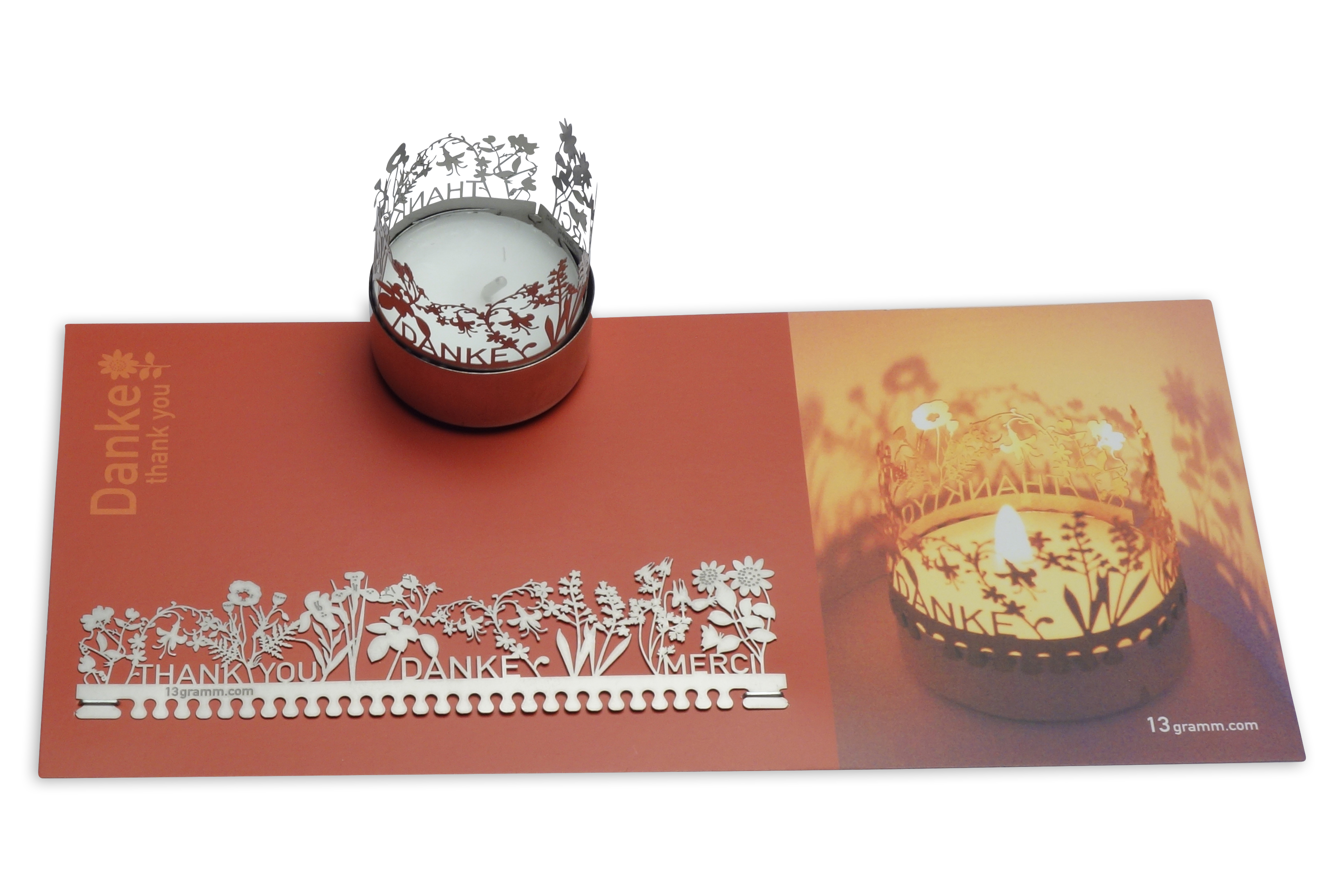 Material: Edelstahl für die Danke Silhouette aus hochvergütetem Federstahl (passend für alle handelsüblichen Teelichter), Papier für die Danke Trägerkarte. Die Danke Silhouette kommt auf einer Trägerkarte im DIN lang Format zu Ihnen. Einfach in einen Umschlag stecken und für kleines Geld in die ganze Welt versenden. Passend für alle handelsüblichen Teelichter.