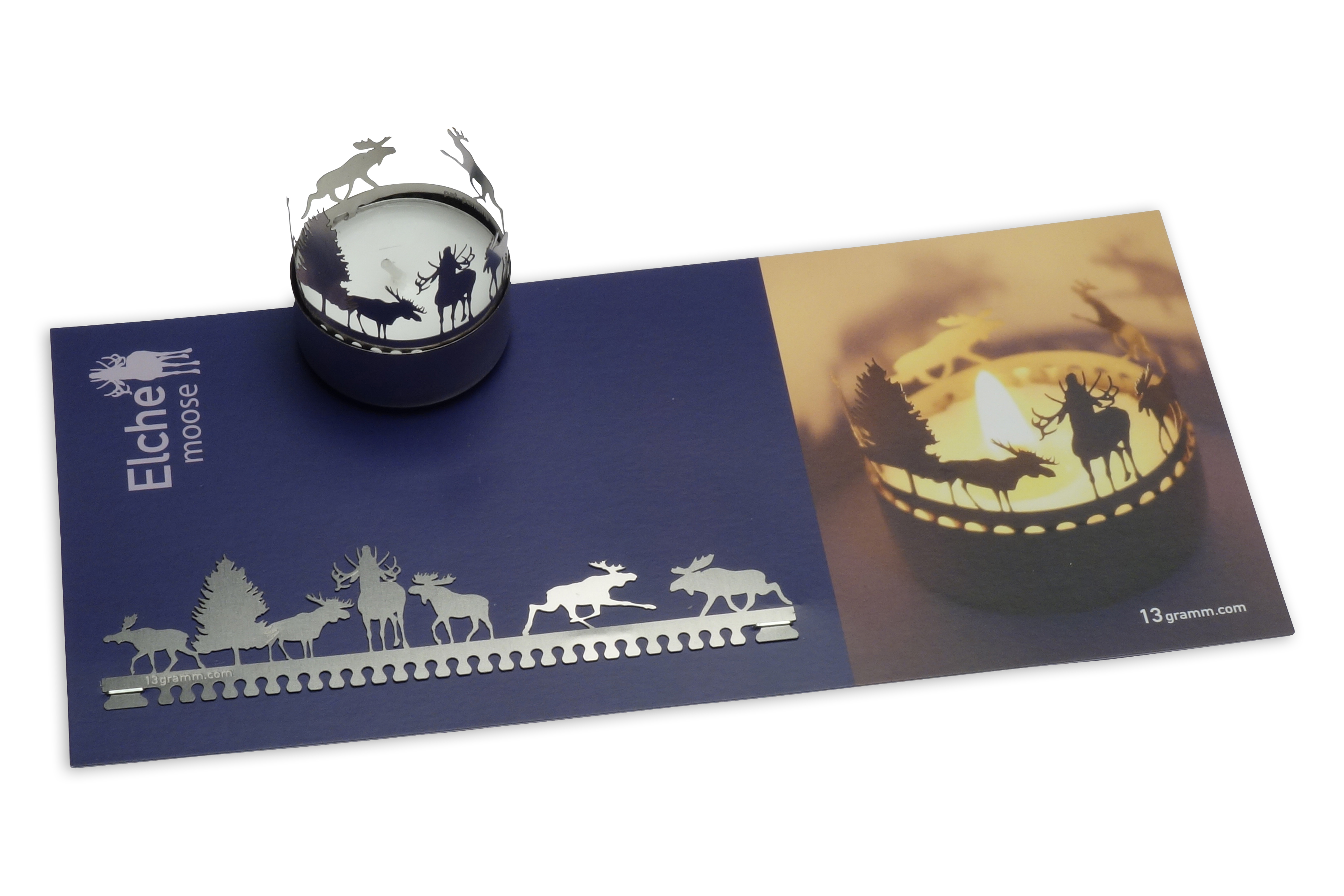 Material: Edelstahl für die Elch Silhouette aus hochvergütetem Federstahl (passend für alle handelsüblichen Teelichter), Papier für die Elch Trägerkarte. Die Elch Silhouette kommt auf einer Trägerkarte im DIN lang Format zu Ihnen. Einfach in einen Umschlag stecken und für kleines Geld in die ganze Welt versenden. Passend für alle handelsüblichen Teelichter. Lieferung ohne Teelicht