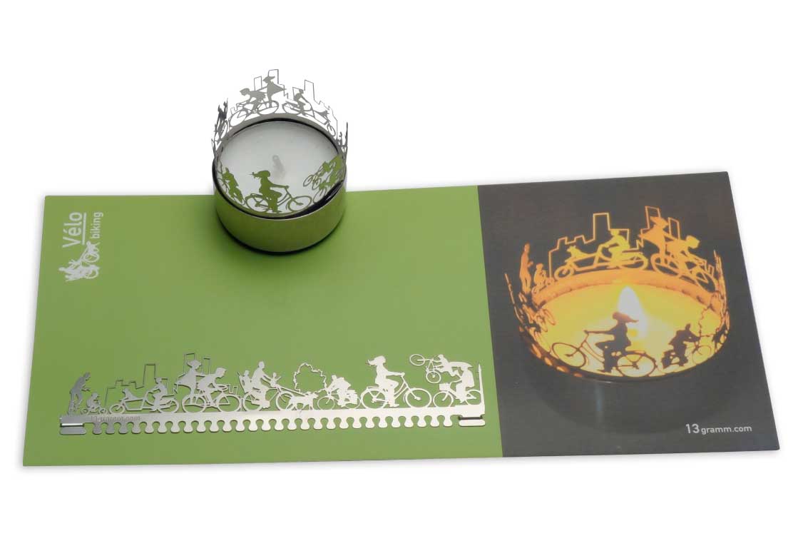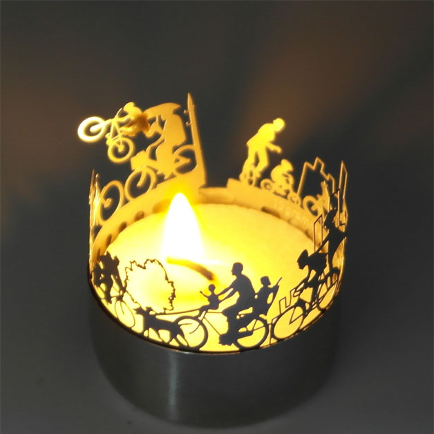 Die Fahrrad Windlicht Schattenspiel Kerze ist ein ideales Geschenk für alle Fahrrad-Liebhaber. Die Silhouette ist aus hochwertigem Edelstahl gefertigt und unbegrenzt wiederverwendbar. Geliefert mit einer Fahrrad-Postkarte ist dies ein Geschenk, optimal zum Weiterverschenken. Dazu sozio-ökologisch gefertigt, sodass auch Verantwortung für Umwelt und Mensch übernommen wird bei dieser Geschenkidee.