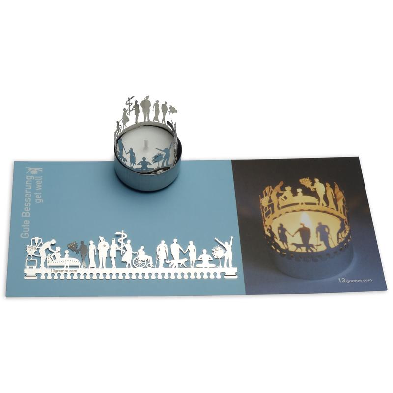 Das 13gramm Gute Besserung Windlicht-Schattenspiel zeigt Ihnen die schönsten Motive rund ums Thema Gute Besserung auf eine Weise, in der Sie Gute Besserung bestimmt noch nie betrachtet haben. Durch das Flackern der Kerze erwacht die Silhouette zum Leben. Ideal zum Verschenken!