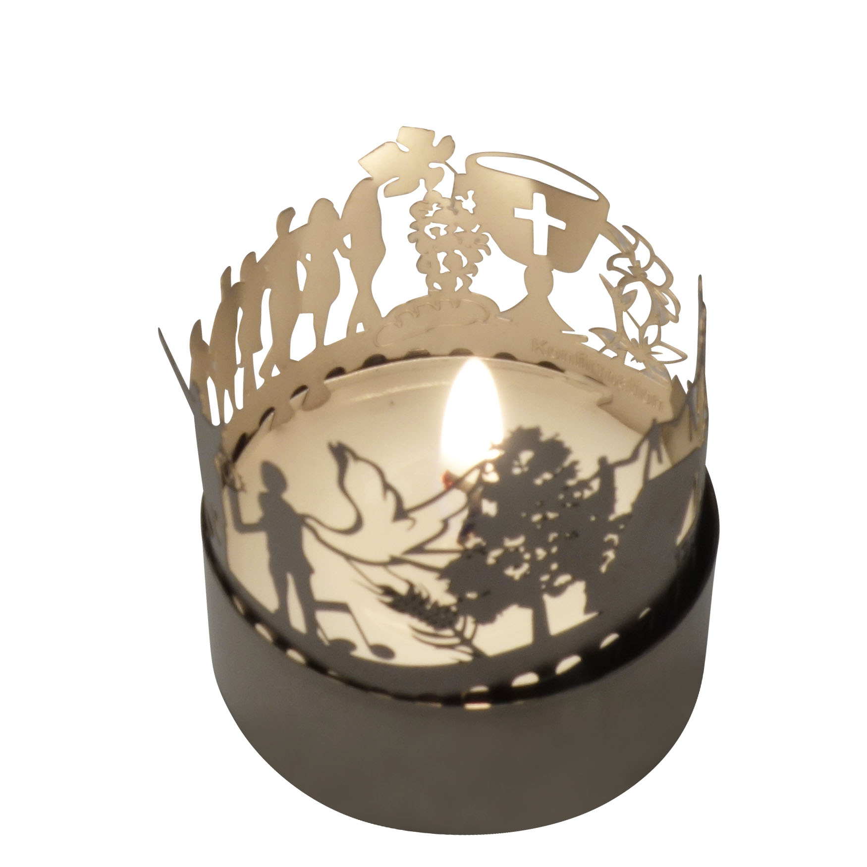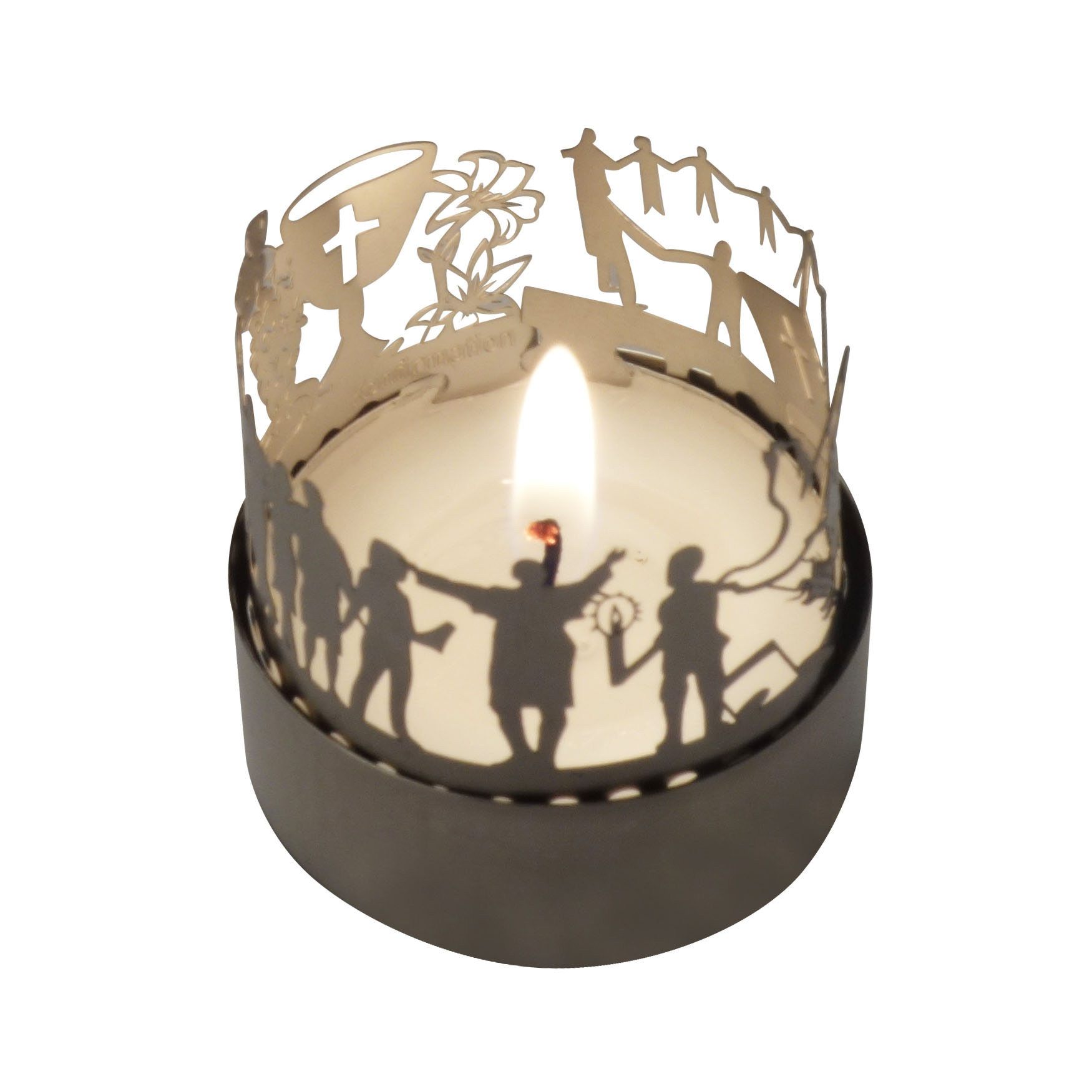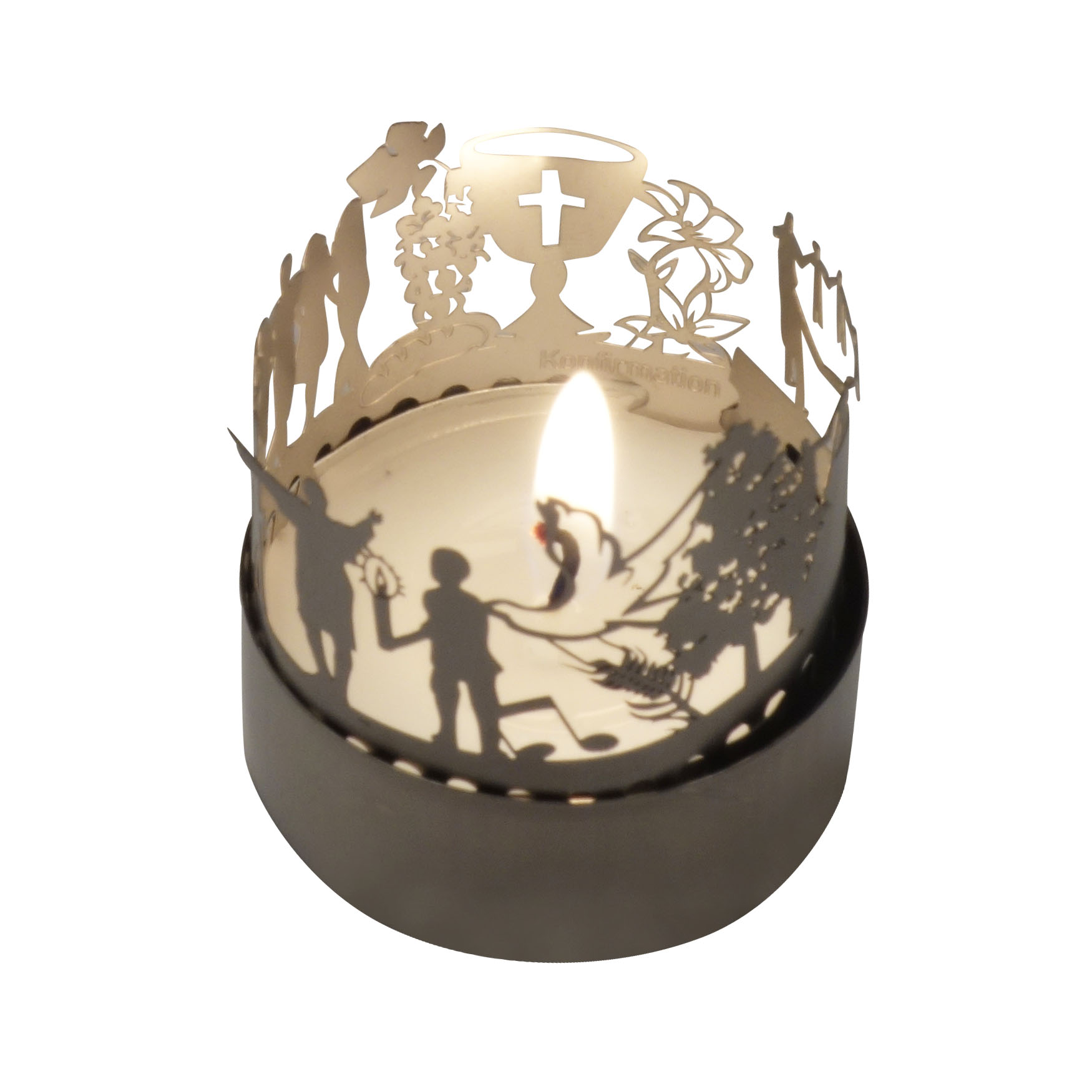 Lassen Sie sich verzaubern von diesem einzigartigen Konfirmation T-Light Schauspiel. Das 13gramm Windlicht-Schattenspiel zeigt Ihnen die schönsten Motive rund ums Thema Konfirmation. Durch das Flackern der Kerze erwacht die Silhouette zum Leben, mit viel Liebe zum Detail wurde dieses Motiv für Sie en miniature präsentiert. Ideal zum Verschenken oder Selbstbehalten, machen Sie jemanden eine Freude und bringen Sie jemanden zum Leuchten!