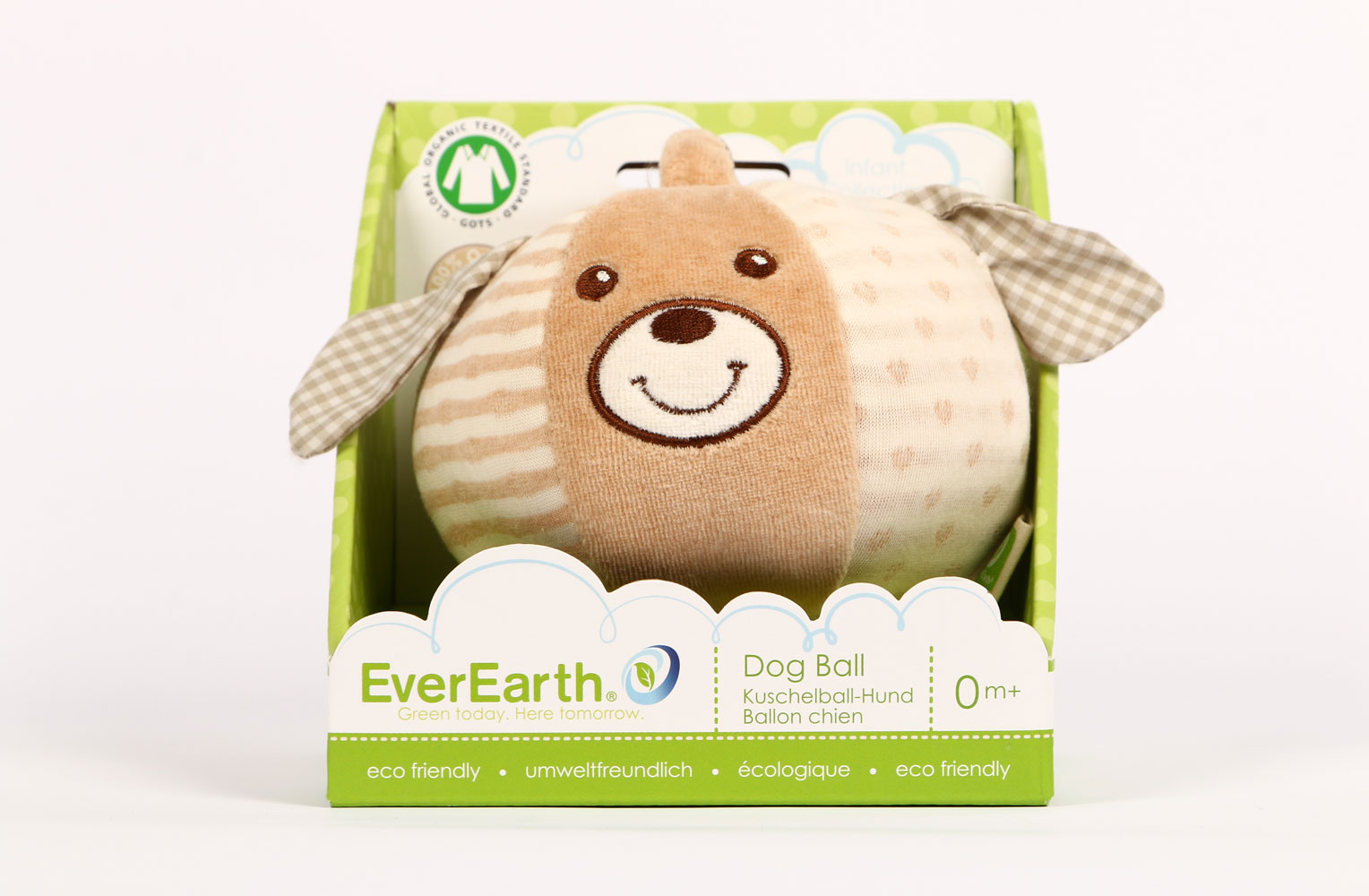 Der 12cm große Kuschelball-Hund ist ein weiches Spielzeug aus organischer Baumwolle, perfekt zum Spielen und Kuscheln.
