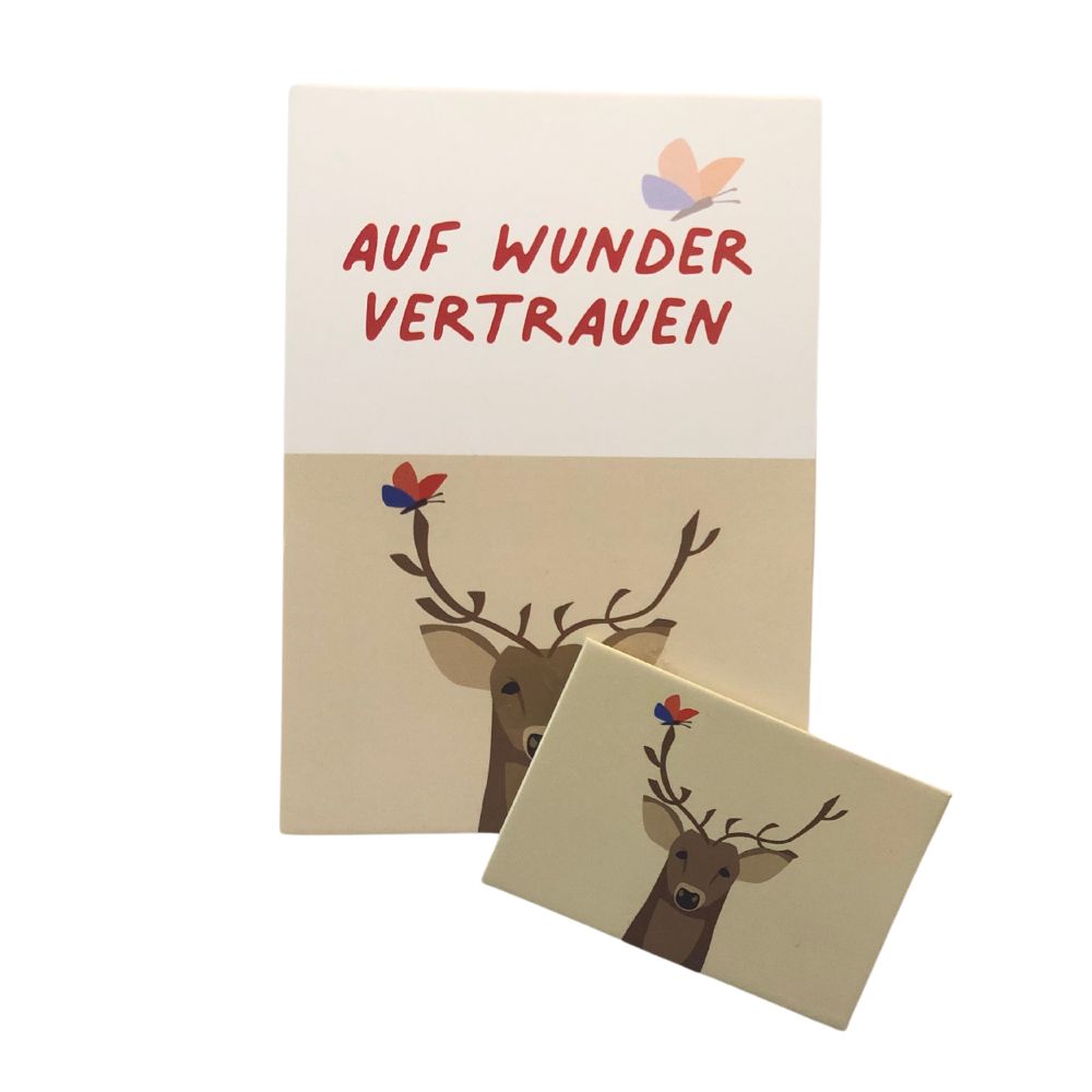 Unser liebevoll illustrierter Magnet, auf dem sich Hirsch und Schmetterling begegnen, versprüht den Glauben an die wunderbaren Seiten des Lebens. Mit hübscher Grußkarte in derselben Optik für eine inspirierende Botschaft an den Beschenkten.