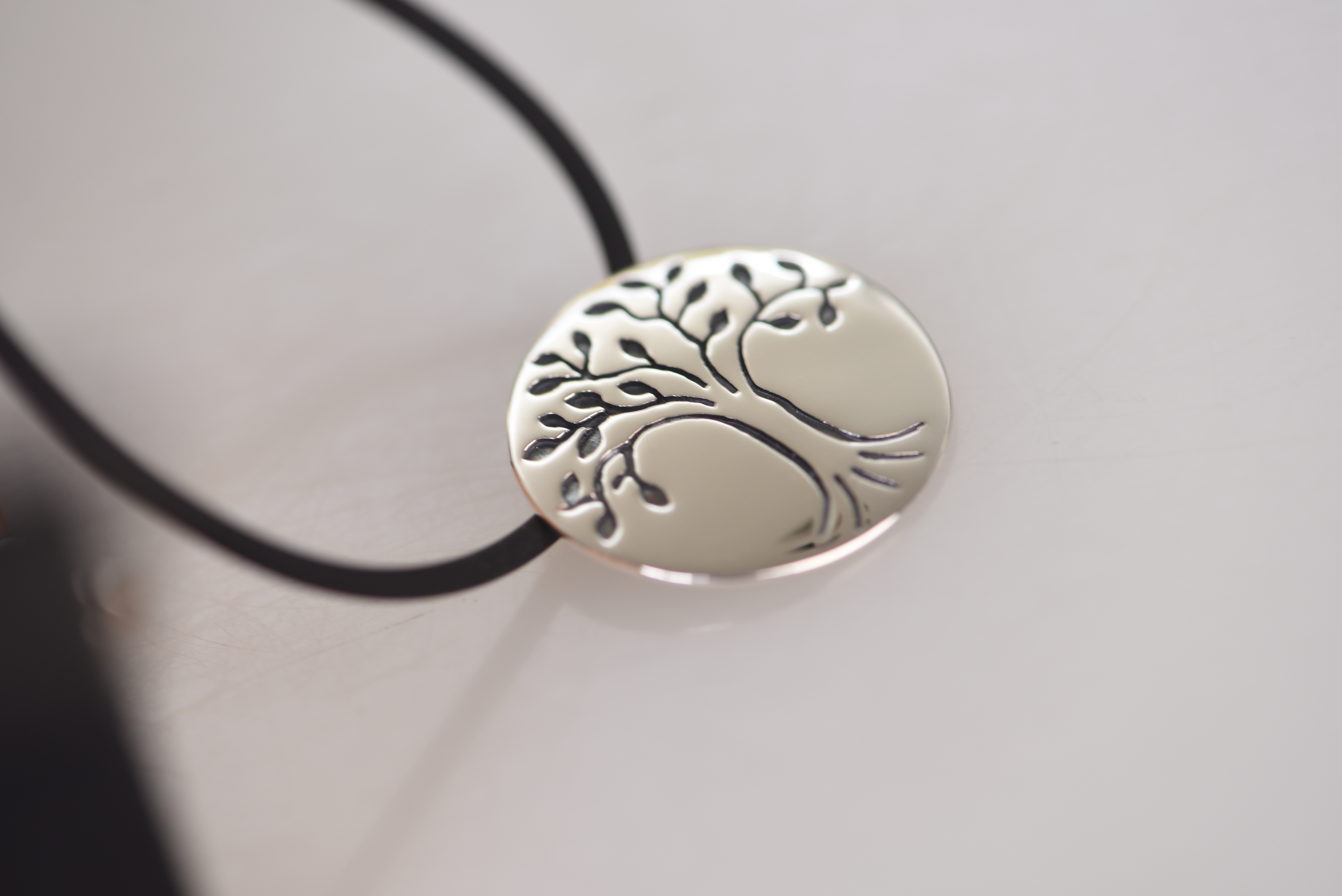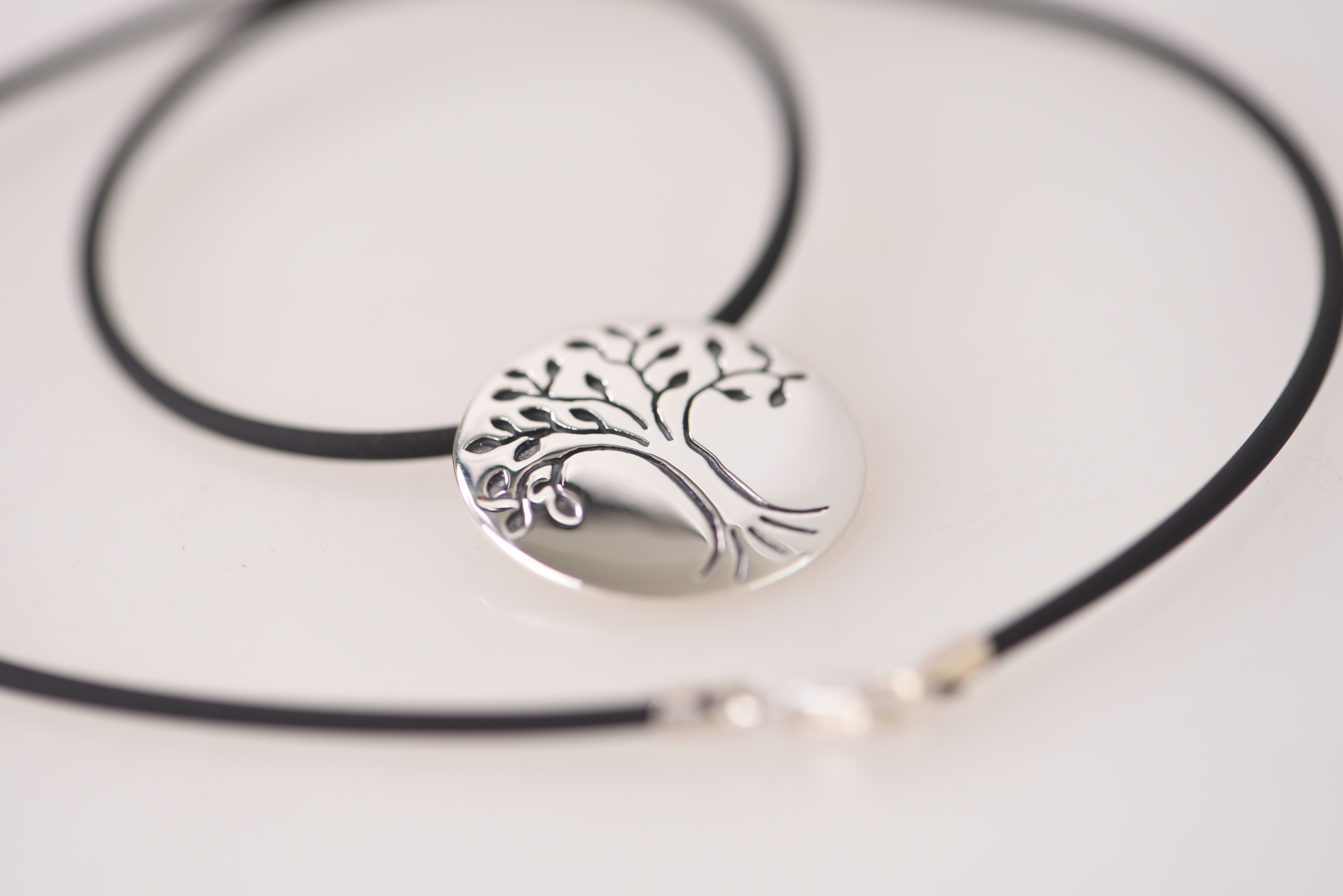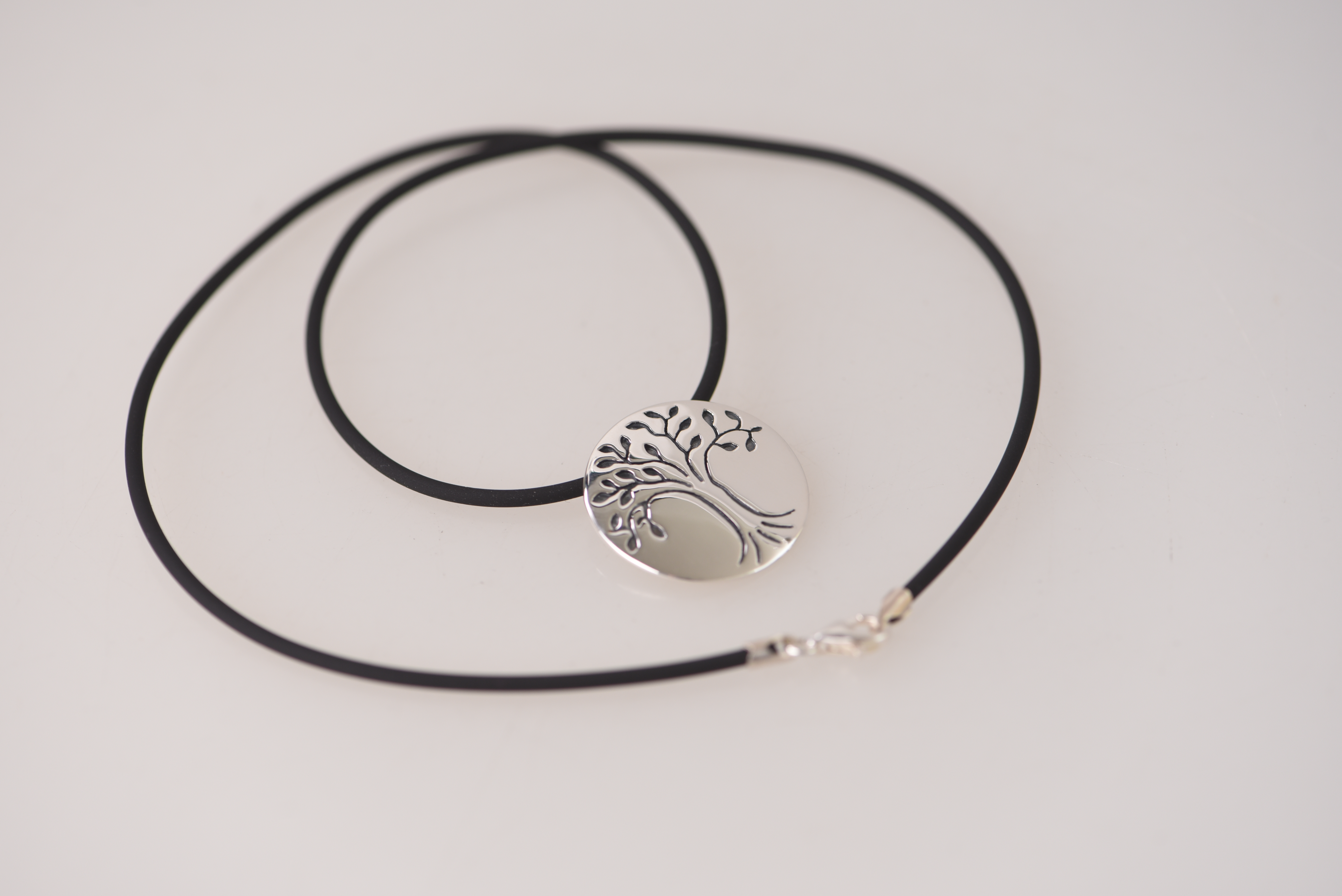 Ein zeitlos schöner Anhänger aus 925er Silber an einem Band aus Naturkautschuk mit dem Baum des Lebens als Motiv. Ein tolles Geschenk.
