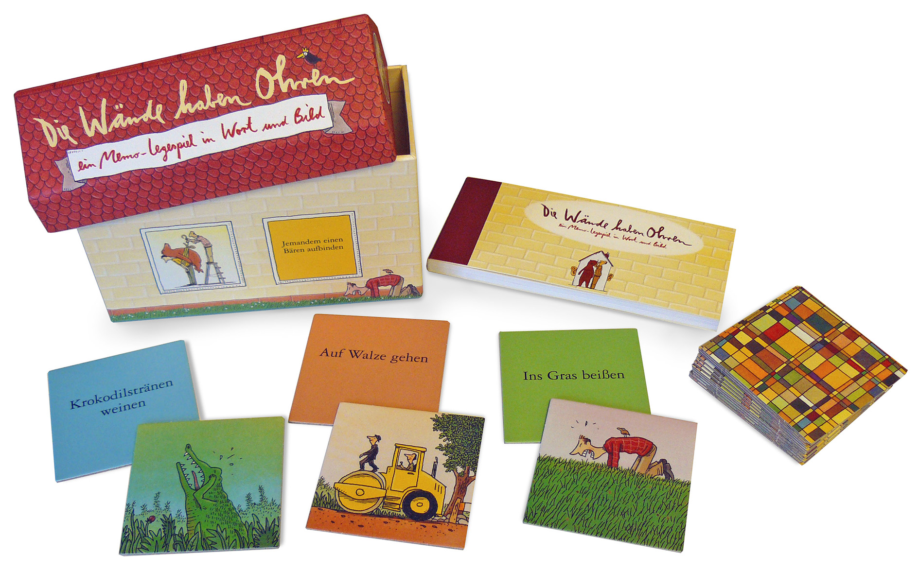 Die Paare bestehen aus einem Bild, das die Redensart wörtlich veranschaulicht, und der Redewendung selbst. In einem ausführlichen Begleitbuch werden die Redensarten erklärt. Die Weisheiten sind in der Regel keine Formulierungen von Schriftstellern, sondern wurden meist direkt dem Alltag entnommen. Hinreißend sind die prägnanten Zeichnungen von Philip Waechter, die jede Wendung beim Wort nehmen. Der renommierte Zeichner und Illustrator vermag es, den Sprachwitz augenzwinkernd zu verbildlichen. Beim Spielen ist es eine große Freude, die zu den Zeichnungen gehörige Redensart zu überlegen und dann als Textmemokarte zu finden.