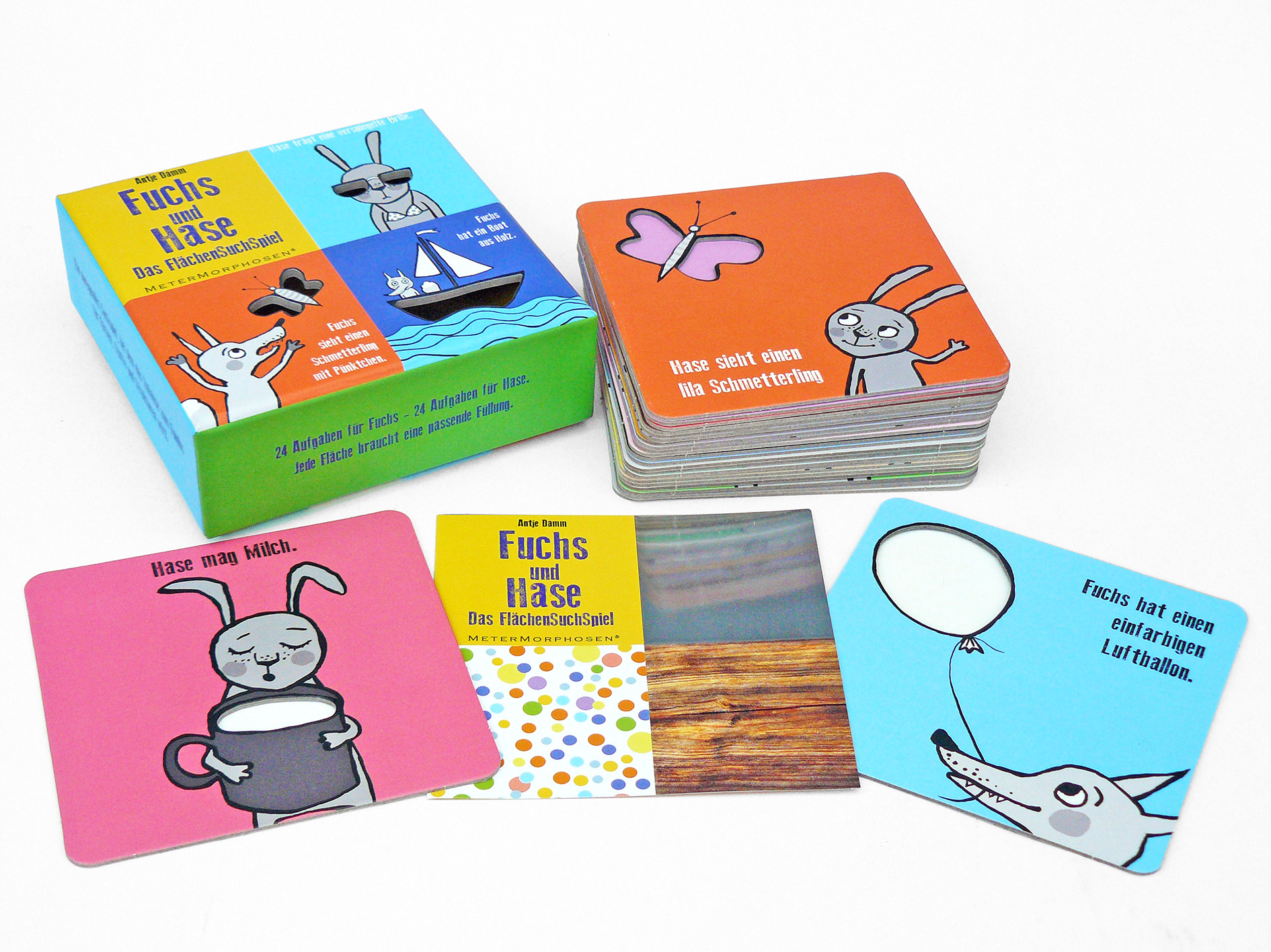 Antje Damm hat sich für MeterMorphosen wieder etwas Neues, besonders Originelles ausgedacht. Ihr FlächenSuchSpiel macht Wohnung, Straße, Spielplatz und Garten zum Farb- und Flächen-Suchlabor, denn es gilt, alle ausgestanzten Flächen passend zu füllen. Hase mag Bücher mit Buchstaben, Fuchs mag Bücher mit Bildern heißt es etwa auf den Karten - entsprechend müssen die Füllungen vorgenommen werden. Die 24 dicken Karten mit unterschiedlichsten Öffnungen zeigen auf der einen Seite die Welt von Hase und auf der anderen Seite die Welt von Fuchs. Die Stanzungen betreffen immer beide Seiten.