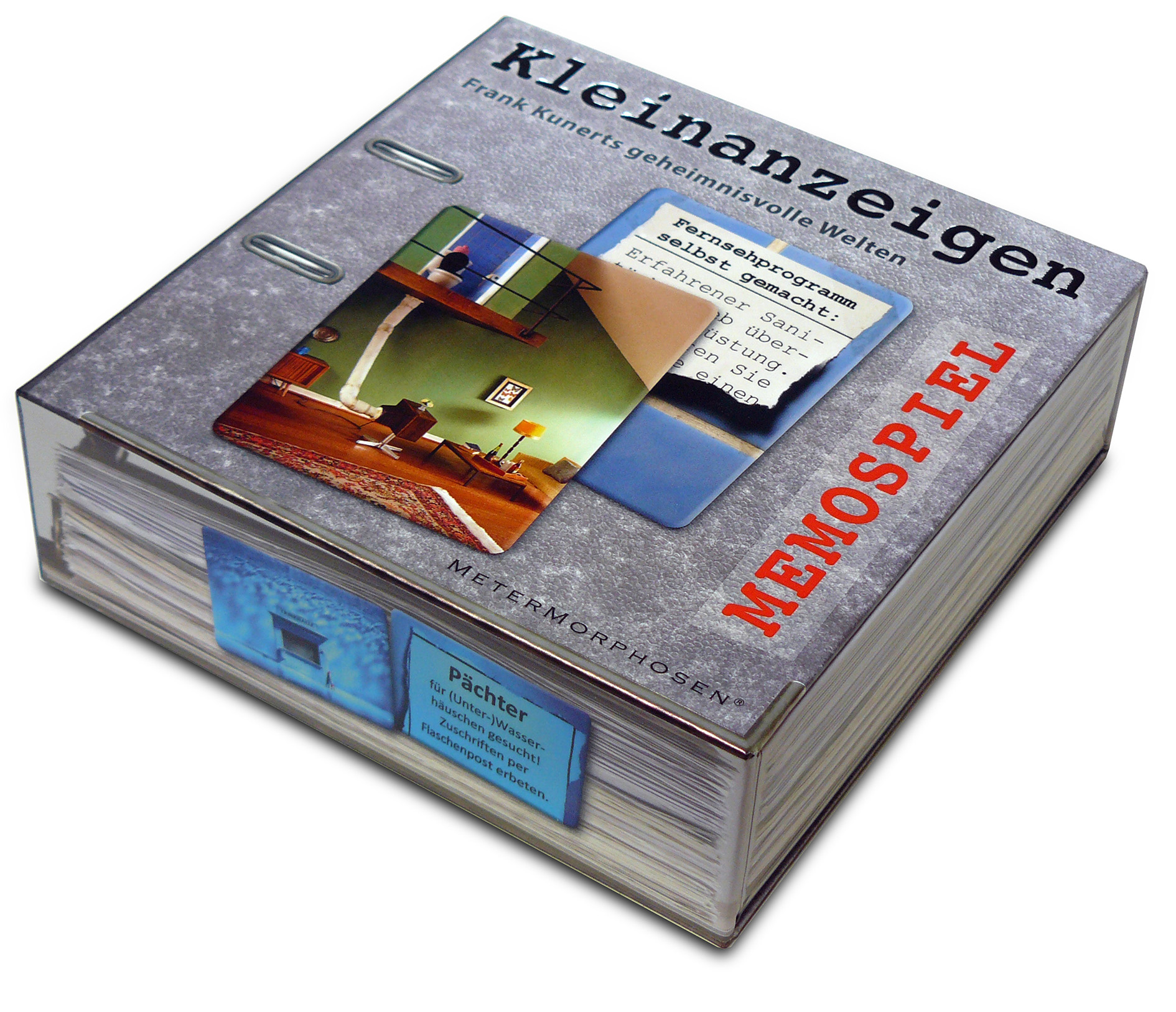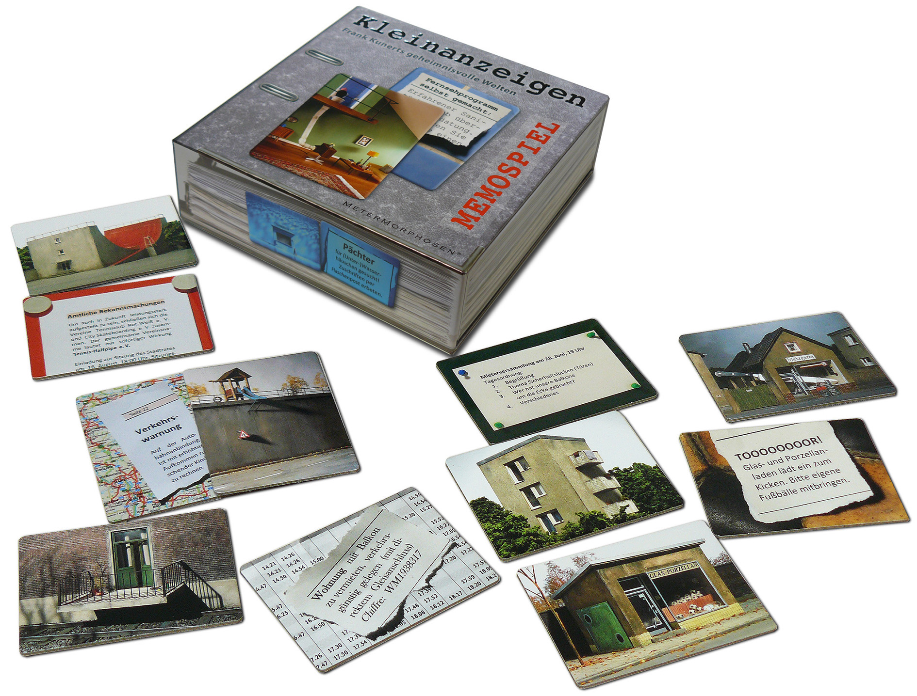 Frank Kunert zählt zu den großen Fotografen der Gegenwart, seine Bilder erzählen ganze Geschichten. Im neuen Memospiel von MeterMorphosen kommen zu den 36 Motiven 36 kurze Texte in Form von Kleinanzeigen hinzu, die Details und Abgründe zu den Bildern verraten. Die Tageszeitung, die auch auf dem Friedhof noch in den Grabstein eingeworfen wird, eine Rutsche, die direkt auf einer Schnellstraße landet, ein Hausmeisterjob inmitten eines Atom-Reaktors mit idyllischem Balkon: Die sorgsam komponierten Bilder haben oft einen doppelten Boden und bergen viel Komik. 72 Karten im edlen Schuber in Leitz-Ordner-Optik und auch -Haptik.