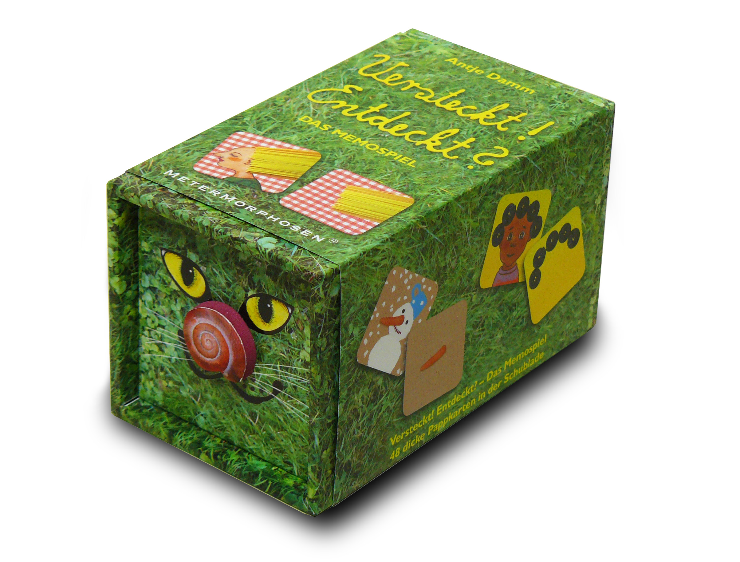 Ein neues kreatives Memospiel voller Assoziationen, gestaltet von der bekannten Kinderbuch-Illustratorin Antje Damm. Aus einem Alltagsgegenstand wird bei diesem kompakten Memospiel im Handumdrehen ein Gesicht – oder man ist aufgefordert, anders herum die manchmal gut versteckten Dinge in den Gesichtern zu entdecken. So ist Versteckt! – Entdeckt? eine Weiterführung des MeterMorphosen-Memo-Klassikers Was ist das?, bei dem Alltagsgegenstände in Tiere verwandelt werden. Im neuen Spiel gilt es nun, Paare zusammenzufinden, bei denen ein Gegenstand in ein Gesicht verwandelt oder darin zu finden ist. Aus Spaghetti wird eine Haarpracht, aus einem Pfannkuchen eine Gesichtsform, aus einem Schlüssel eine Brille und aus dem Bauchnabel wird ein Mund.