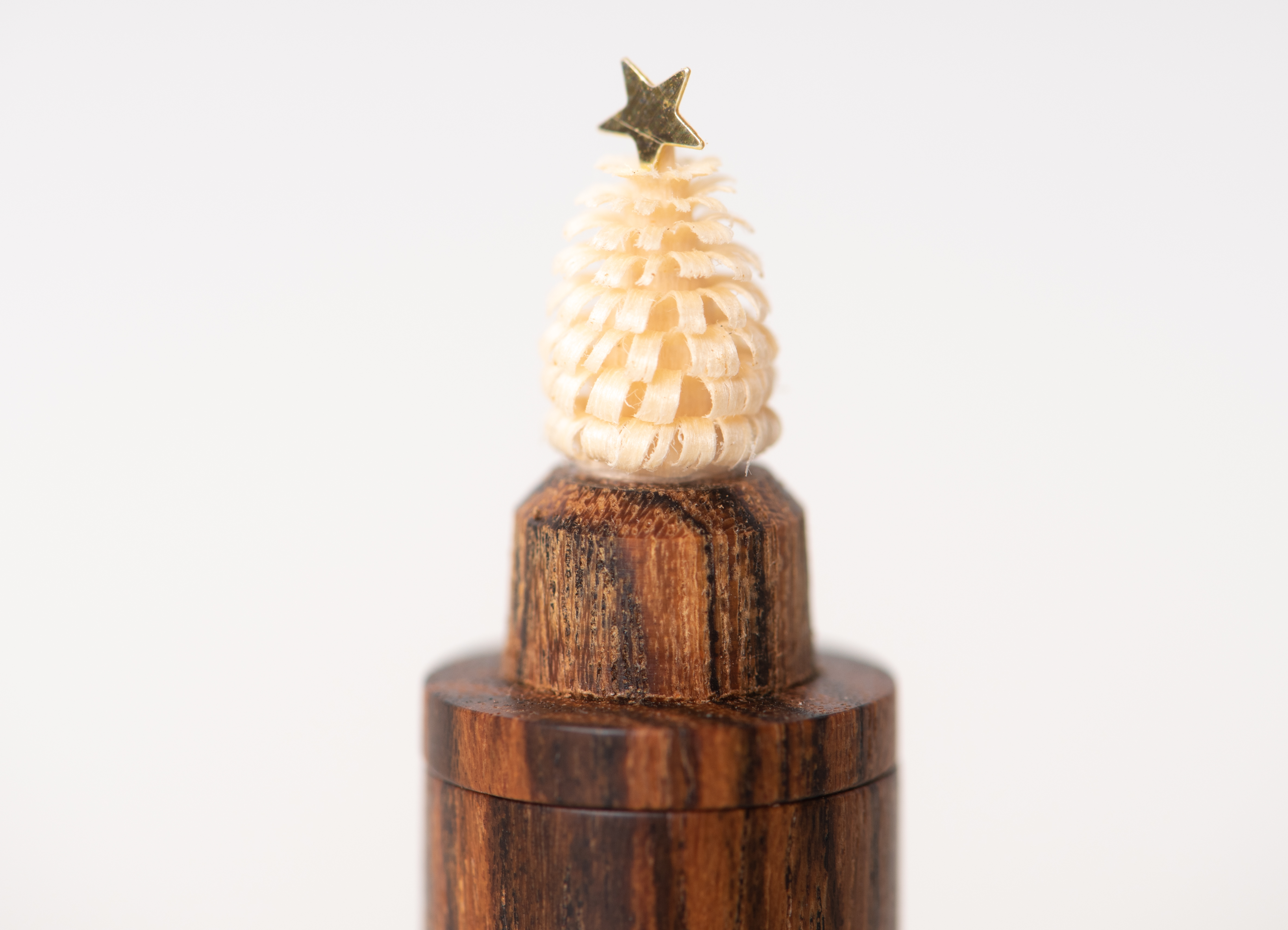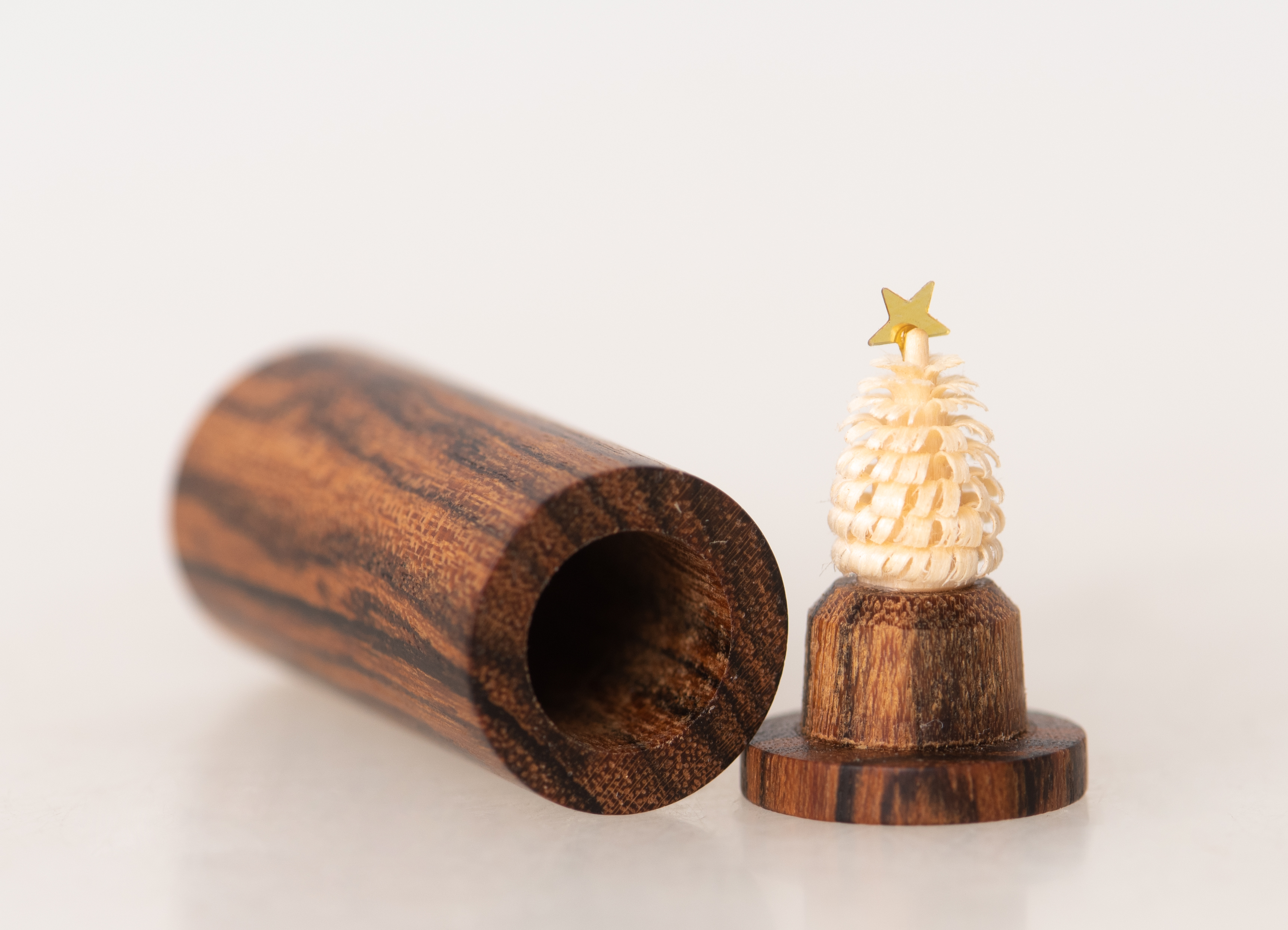 Der winzige Weihnachtsbaum aus Eschenholz ist handgedrechselt und passt in die Hosentasche.