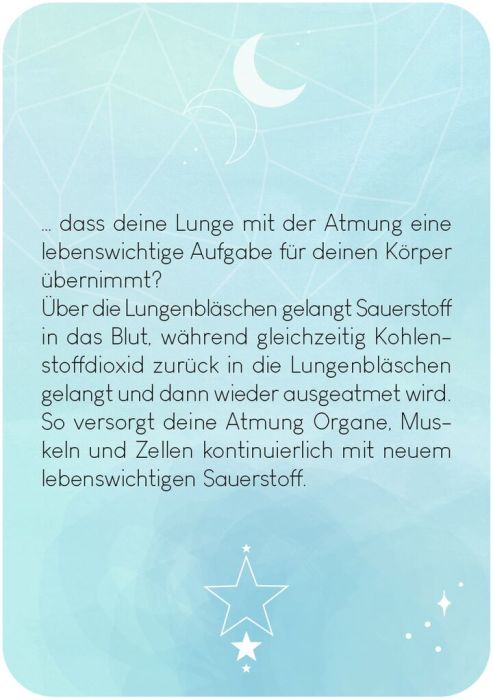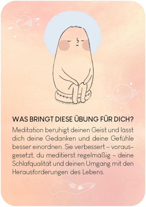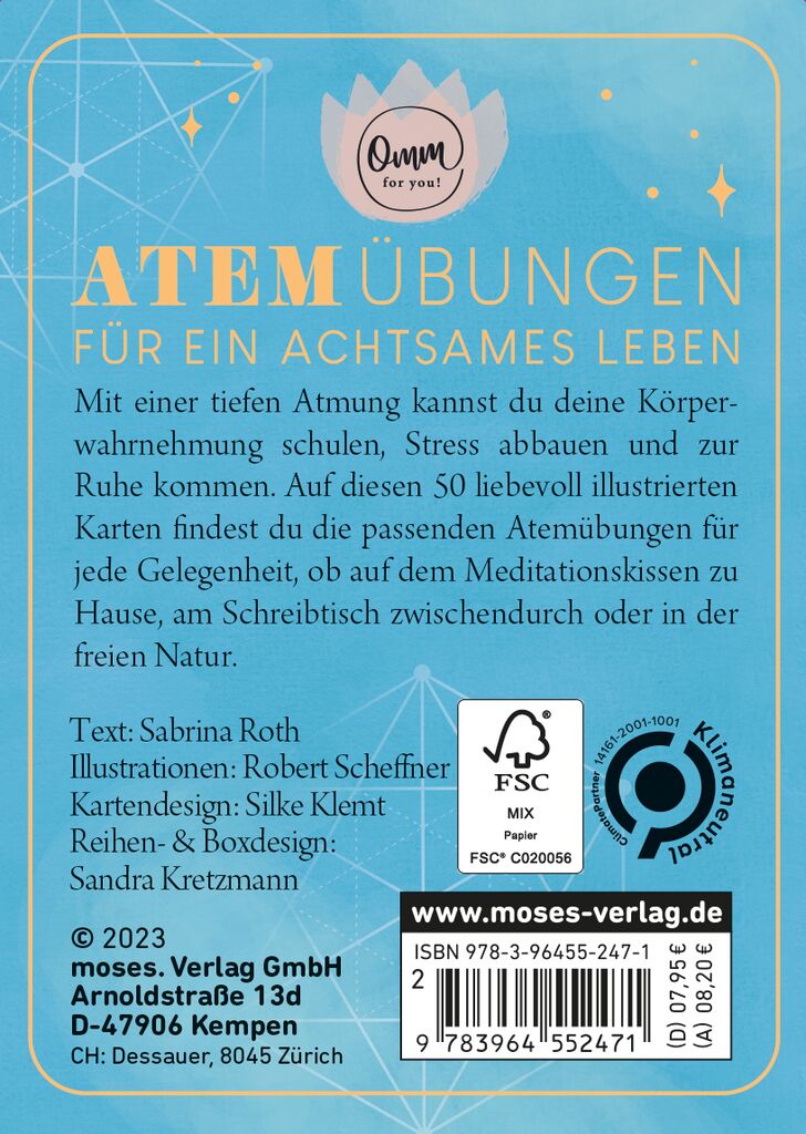 Mit einem tiefen Atem kann man seine Körperwahrnehmung schulen, Stress abbauen und Ruhe-Oasen entdecken. Auf diesen 50 liebevoll illustrierten Karten gibt es passende Atemübungen für jede Gelegenheit zu entdecken: Sei es auf dem Meditationskissen zu Hause, am Schreibtisch zwischendurch oder in der freien Natur.