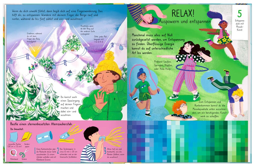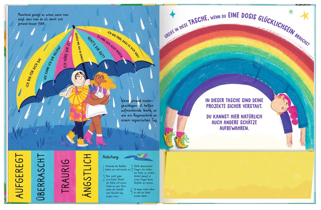 Mit diesem Buch fühlt man sich stärker – Seite für Seite. Es ist außergewöhnlich und besonders – so wie jeder einzelne von uns. Mit mehr als 30 Projekten, Aktivitäten und Ideen wird Kindern ein gutes, selbstbewusstes, konzentriertes, gelassenes und lockeres Gefühl vermittelt. Jede Aktion kann auf den perforierten Seitenherausgetrennt oder ausgeschnitten und am Ende in einer Glückstasche gesammelt werden.