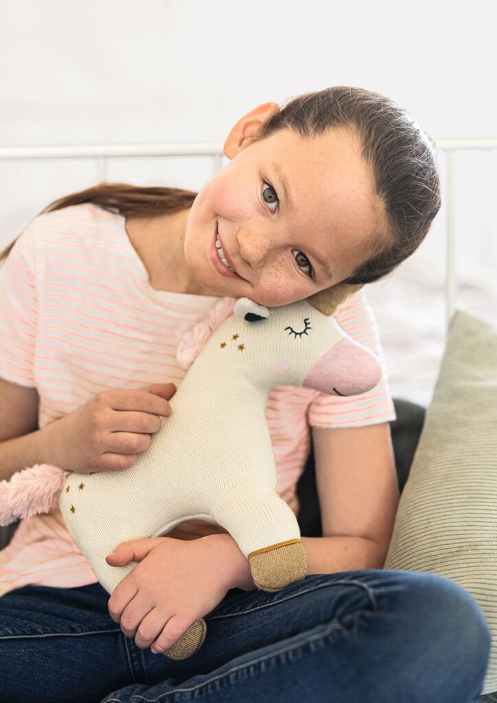 Dieses Einhorn lässt Kinderherzen höherschlagen. Mit seinem weichen Fell ist es der perfekte Kuschel – und Spielpartner.