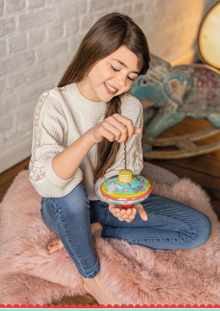 Nostalgischer Kreisel mit klassischer Drillstange, kreiselt mit dem markanten Summgeräusch