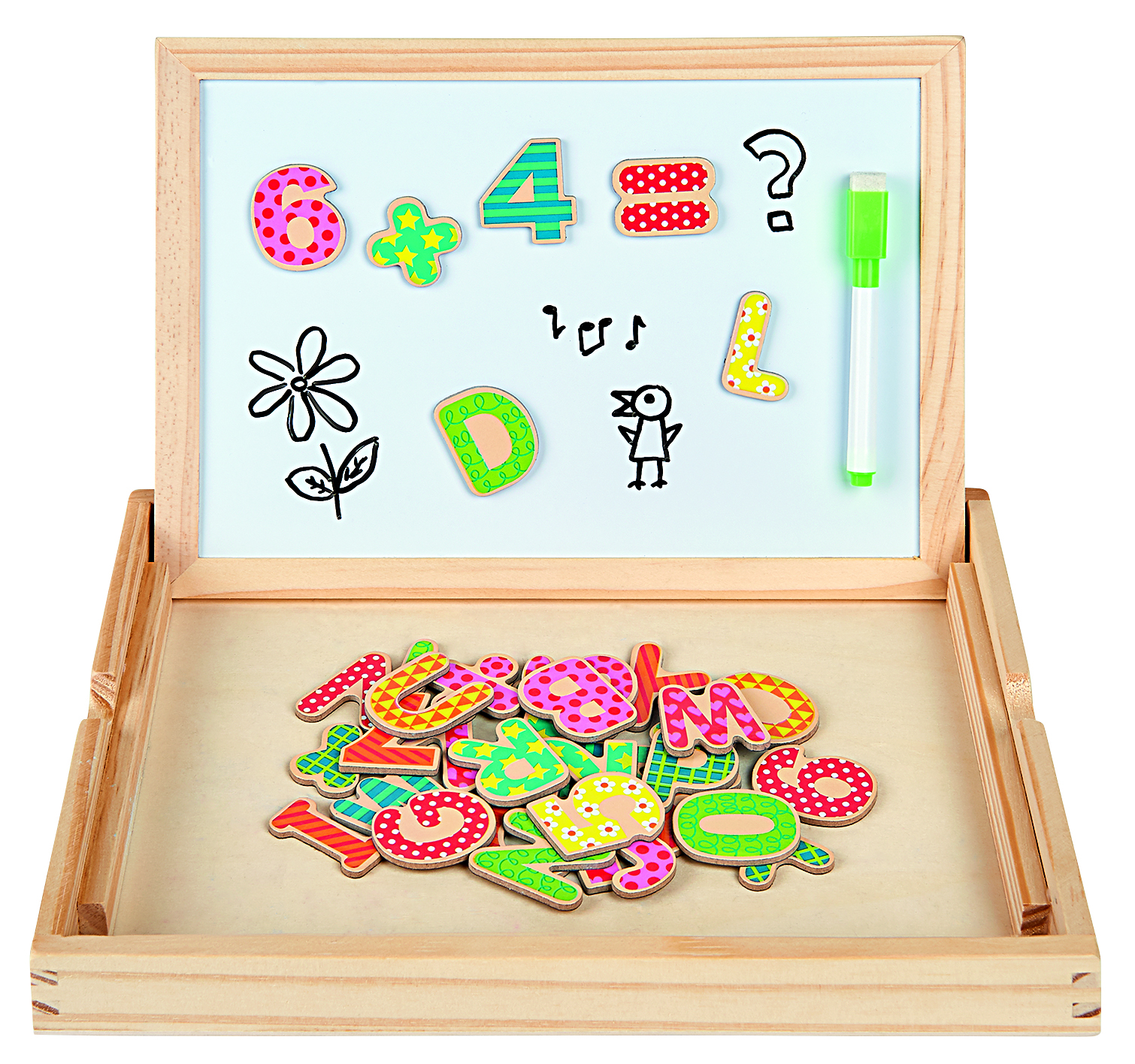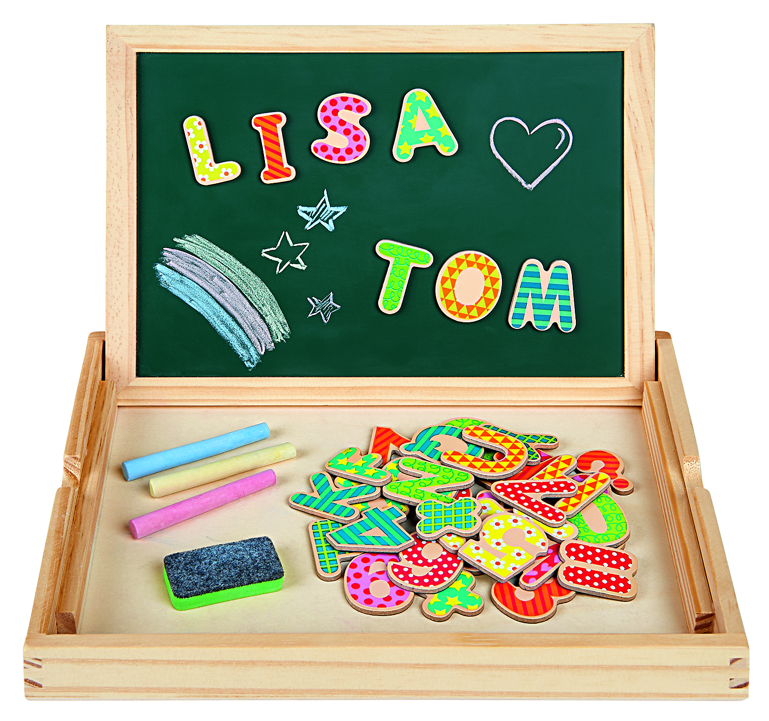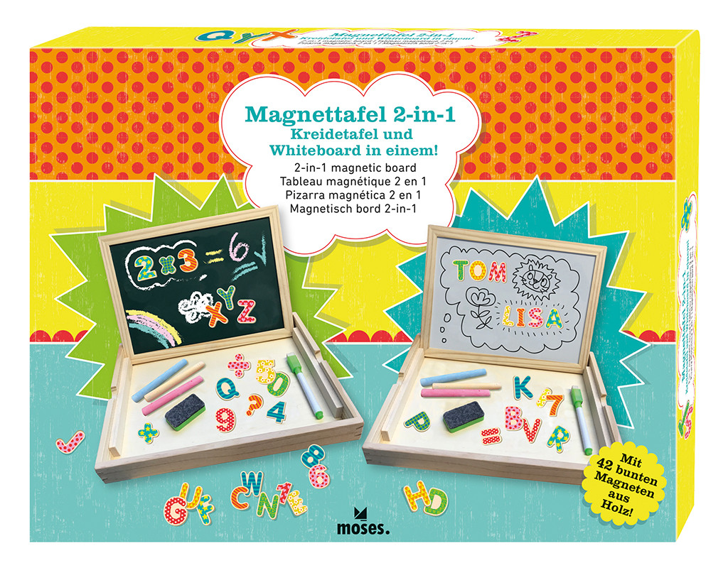 Zur Vorbereitung auf die Schulzeit oder auch für alle, die von der Schule einfach nicht genug bekommen, gibt es die Magnettafel 2-in-1. Die doppelseitige Tafel ist Kreidetafel und Whiteboard in einem - die Vorderseite ist mit Kreide beschreibbar, die Rückseite kann nach Lust und Laune mit dem magnetischen Whiteboard-Stift bemalt werden. Dank des Radierschwämmchens kann alles wieder weggewischt werden und der Mal- und Schreibspaß geht von vorne los. Auch die vielen verschiedenen kunterbunten Buchstaben- und Zahlenmagnete hält die Tafel fest - zum spielend leichten Lernen von ersten Zahlen und dem ABC.