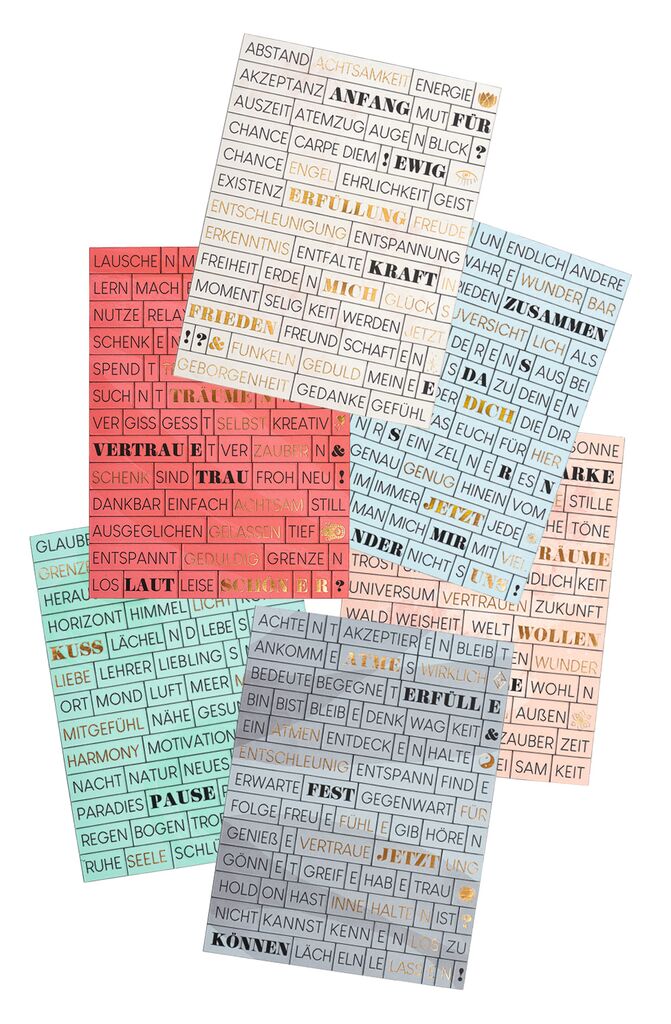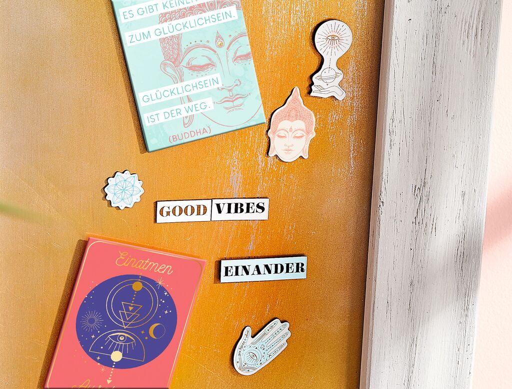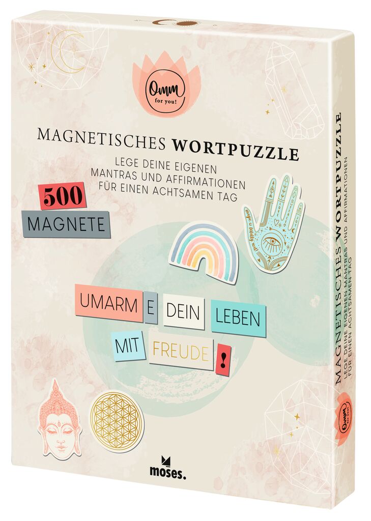 „Heute ist ein schöner Tag“, „Ich bin von Positivität umgeben“ - Mantras und Affirmationen können helfen, den Alltag achtsamer zu gestalten und mit mehr Positivität durchs Leben zu gehen. Das, was man denken oder erreichen möchte, kann man mithilfe einer Affirmation in Worte fassen und mit unserem magnetischen Wortpuzzle sogar visualisieren. Das Set besteht aus sieben vorgestanzten Magnetbögen mit insgesamt 500 Wörtern, Wortendungen und Symbolen. Besonders hübsch ist die Goldveredelung mancher Magnete. So lassen sich unglaublich viele verschiedene eigene Affirmationen und Mantras für einen achtsamen Tag kombinieren. Da wird der Blick zum Kühlschrank oder auf die Pinnwand zum täglich Motivations- und Inspirationsschub. Verpackt in einer aufwendig gestalteten Geschenkbox können Sie einem lieben Menschen mit dem magnetischen Wortpuzzle sicher eine große Freude sein – auch dann, wenn dieser liebe Mensch Sie selber sind.