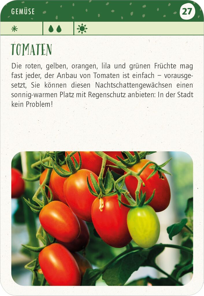 Mit diesen 50 Karten kann man sich ganz einfach sein leckeres Ernteglück pflanzen, denn hier findet man alles Wichtige rund um das Anpflanzen und Ernten von Gemüse, Obst, Früchten, Kräutern und essbaren Blüten.
