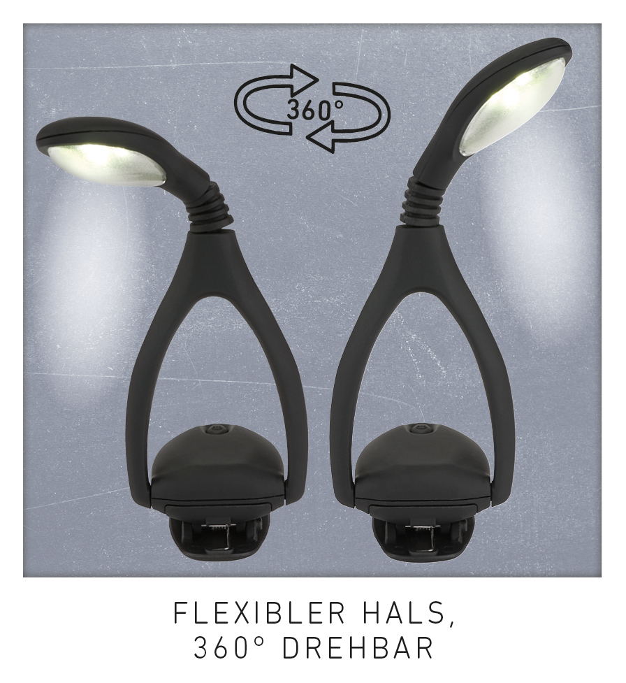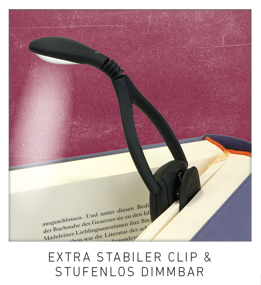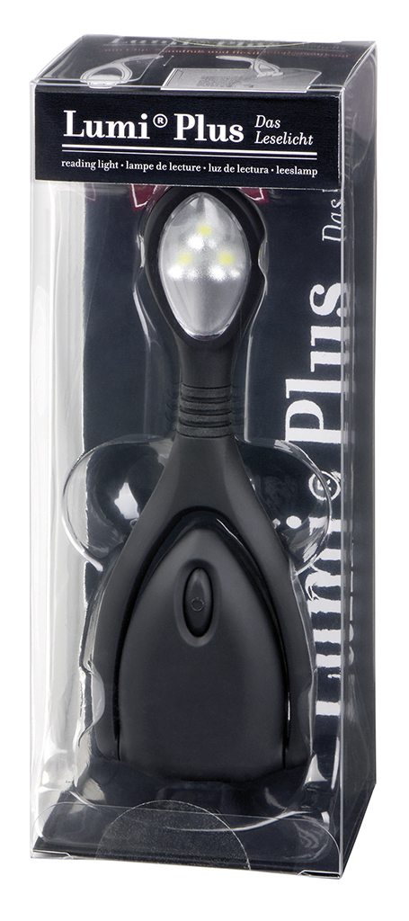Das verbesserte Design des Lumi Plus überzeugt durch eine besonders hochwertige Verarbeitung. Das stufenlos dimmbare Leselicht mit 3 SMD LEDs verspricht eine Leuchtdauer von bis zu 18 Stunden und bietet sowohl einen hohen Lesekomfort als auch eine optimale Leseleistung durch den leistungsfähigen Lichtstrahl. Der Leuchtkopf hat einen superflexiblen Hals, wodurch er um 360° in alle Richtungen geschwenkt werden kann. Der Clip zum Befestigen am Buch ist besonders stabil und garantiert einen sicheren Halt zwischen den Buchseiten. Umgeklappt dient der Clip auch als stabiler Standfuß, sodass das Leselicht auch auf einer geraden Fläche platziert werden kann.