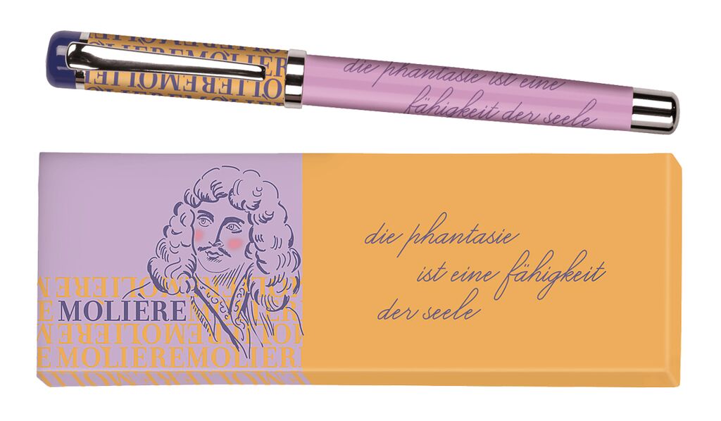 Der französische Dramatiker und Schauspieler Jean-Baptiste Poquelin, besser bekannt als Molière, wird als einer der herausragenden Autoren der Französischen Klassik gefeiert. Molière verfasste zahlreiche Theaterstücke und erlangte besondere Bekanntheit durch seine Charakterkomödien wie "Der eingebildete Kranke" und "Tartuffe". Durch seine Werke erfuhr die Komödie eine ähnliche Bedeutung wie die Tragödie. Eine stilisierte Darstellung von Molière ziert die Schachtel des Tintenrollers. Zusätzlich ziert das Zitat "Die Phantasie ist eine Fähigkeit der Seele" sowohl den Stift als auch die Verpackung, welche in sanften Violett- und Orangetönen gehalten sind.