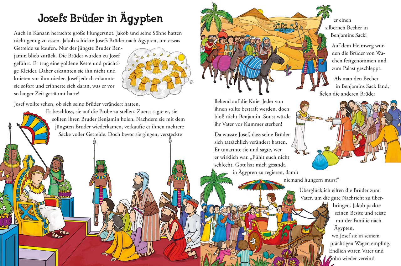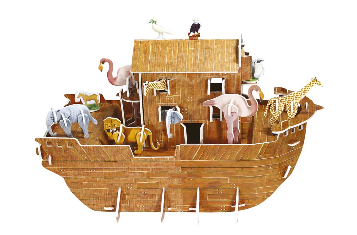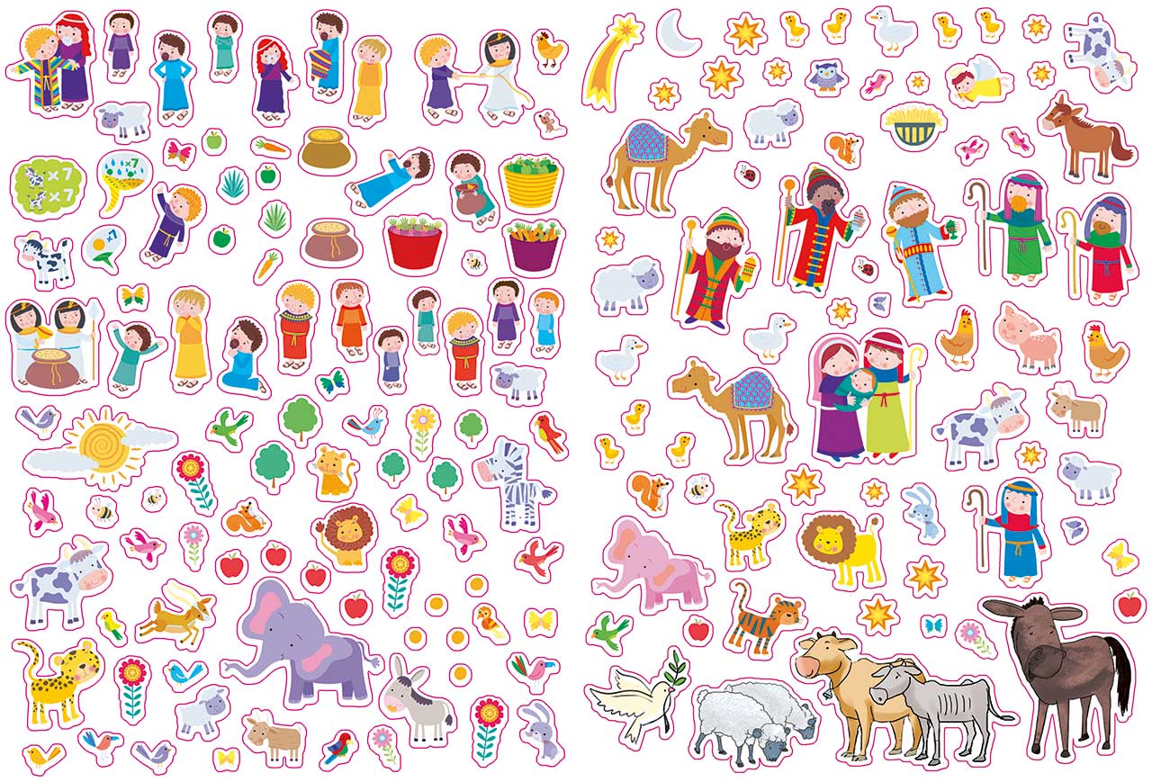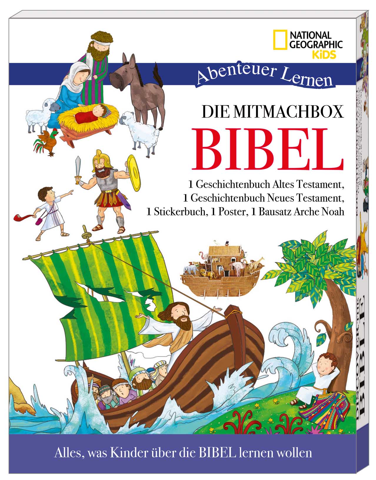 1 Geschichtsbuch Altes Testament, 1 Geschichtsbuch Neues Testament, Stickerheft mit 24 Seiten, 1 Poster, 1 Bausatz Arche Noah
