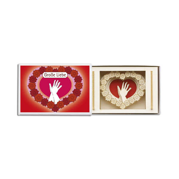 Die gelaserte Miniatur sieht auch auf dem Schreibtisch dekorativ aus. Die Mini-Große Liebe aus finnischer Holzpappe in Handarbeit montiert ist immer ein originelles Geschenk in bunter, handetikettierter Streichholzschachtel.