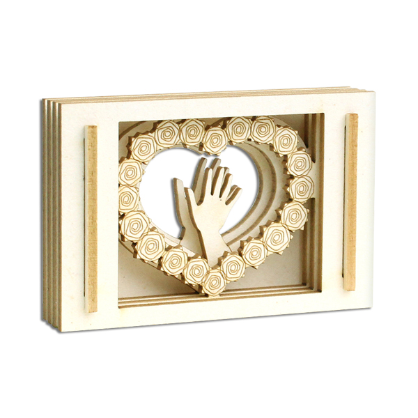Die große Liebe klein verpackt: Auf vier Motivebenen entdeckt man zwei jubelnde Hände, die sich gefunden haben, umrahmt von einem Herz aus Rosen. Ein kleines Symbol für die große Liebe z. B. in einem Blumenstrauß versteckt. Zum Erinnern, Verschenken oder Darandenken.