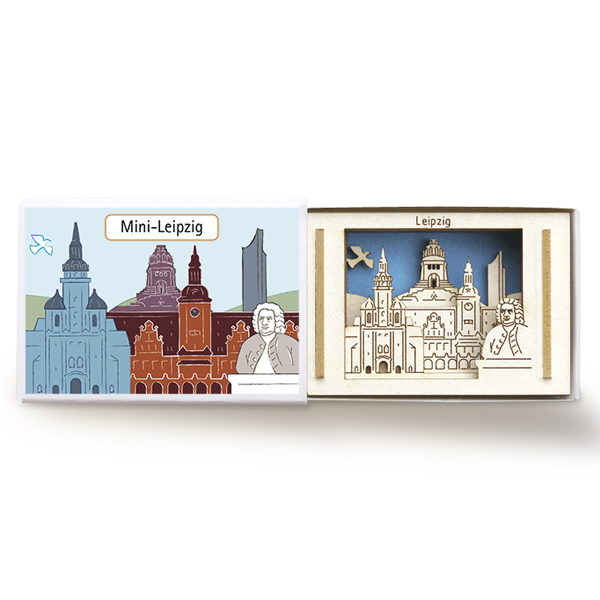 Mini-Leipzig aus finnischer Holzpappe in Handarbeit montiert ist immer ein originelles Geschenk in bunter, handetikettierter Streichholzschachtel.