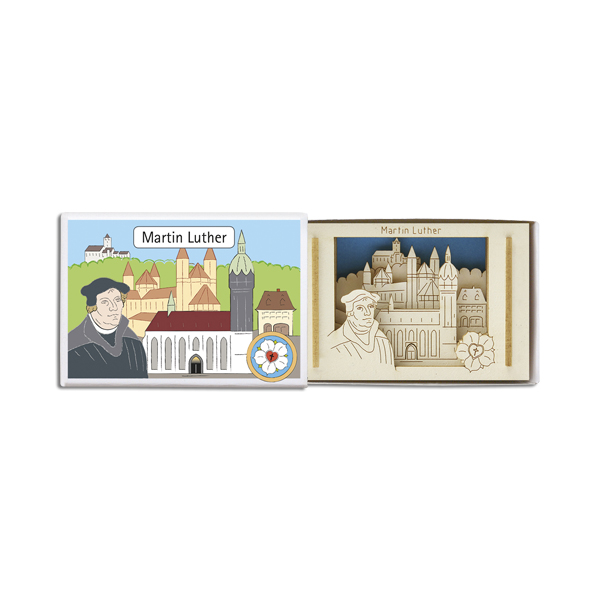 Martin Luther in dreidimensionalem Miniaturformat. Ein schönes Mitbringsel anlässlich des 500- jährigen Reformationsjubiläums 2017. Auf vier Motivebenen entdeckt man Martin Luther, die Lutherrose, das Geburtshaus in Eisleben, die Schlosskirche Wittenberg, den Dom St. Peter zu Worms und die Wartburg in Eisenach.