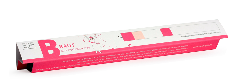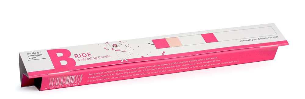 Ein Geschenk, Glückwunsch oder ein Gruß – jedes Thema findet bei uns seine passende Kerze, einzeln in einer farbigen Kartonage verpackt. Die Kerze besteht aus durchgefärbtem Wachs – aufwendig wird bei ihrer Fertigung Farbschicht für Farbschicht von Hand gegossen. Die Verpackungen werden in Hamburg klimaneutral auf FSC zertifiziertem, offenen Designpapier gedruckt und weiterverarbeitet.