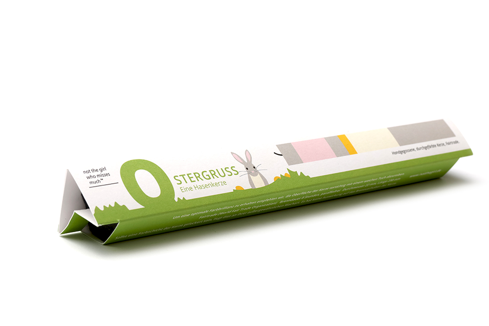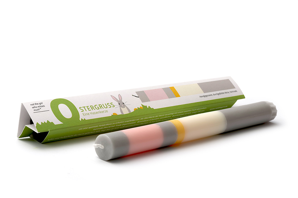 Ostergruß - eine Hasenkerze: Grau, Rosa, Gelb und Weiß - verschmitzt hoppelt der Hase mit Ostern im Sinn übers Feld. Und hinterläßt ebenjenen Farbeindruck, der sich in unserer Grußkerze wiederfindet. Frohe Ostern!