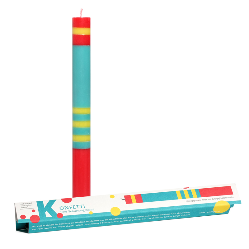 Die Kerzen sind aus durchgefärbtem, farbigen Wachs. Von Hand wird jeweils eine Farbschicht auf die nächste gegossen. Die Kerzen kommen aus fairem Handel, transparent und sozial gefertig. Sie werden in einer Einrichtung für Menschen mit Behinderungen konfektioniert.