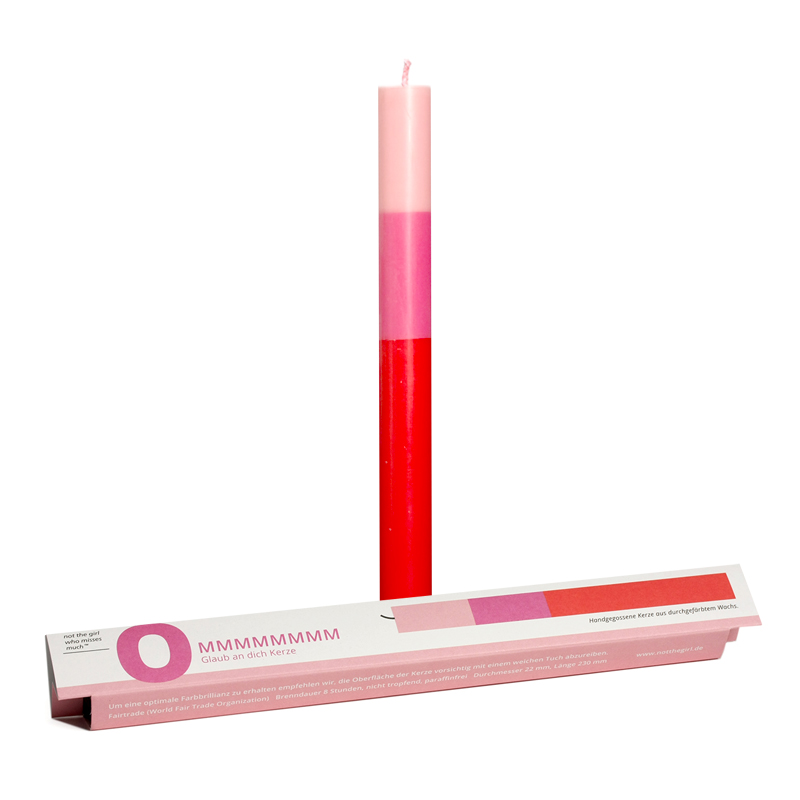 Die Kerzen sind aus durchgefärbtem, farbigen Wachs. Von Hand wird jeweils eine Farbschicht auf die nächste gegossen. Die Kerzen kommen aus fairem Handel, transparent und sozial gefertig. Sie werden in einer Einrichtung für Menschen mit Behinderungen konfektioniert.