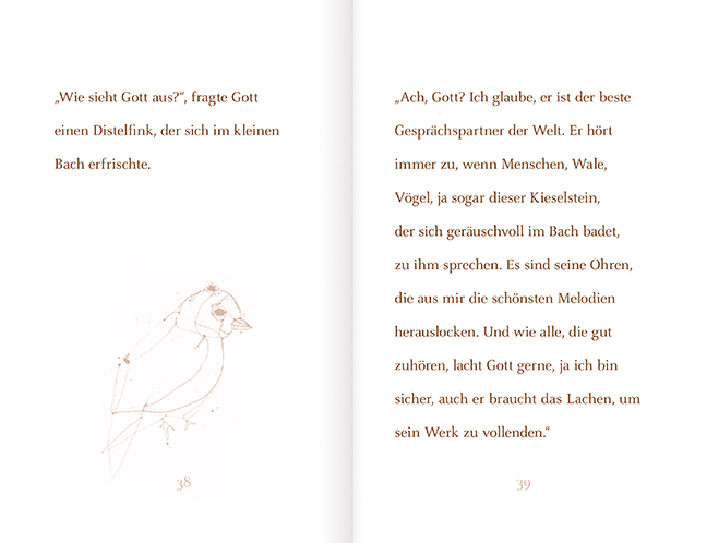 Gott will wissen, wie seine Geschöpfe ihn sehen. Er fragt die Wolke, den Schmetterling, den Fisch und das Atom. Die Wolke weiß sich von guter Hand bewegt, die Maus geschützt, und der Regenbogen ist sicher, dass sich hinter Gott nur ein unvorstellbar humorvoller Zauberer verbergen kann. Am Ende fragt Gott ein kleines Mädchen und einen alten Maler. Über deren Antworten muss er allerdings gründlich nachdenken...