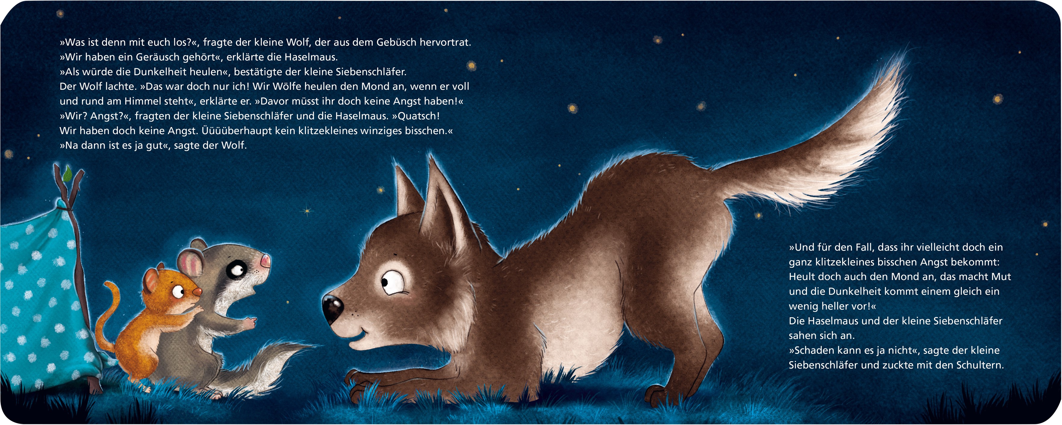 Der kleine Siebenschläfer will heute draußen übernachten. Angst hat er überhaupt kein klitzekleines bisschen! Aber dann, so ganz allein im Dunkeln, wird ihm doch etwas mulmig. Zum Glück hat der kleine Siebenschläfer Freunde, die wissen, wie man Angst ganz schnell vertreibt. Und wer weiß, vielleicht kann es im Dunkeln sogar richtig schön sein?