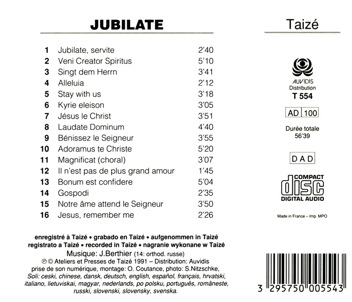1. Jubilate, servite, 2. Veni Creator Spiritus, 3. Singt dem Herrn, 4. Alleluia, 5. Stay with us, 6. Kyrie eleison, 7. Jésus le Christ, 8. Laudate Dominum, 9. Bénissez le Seigneur, 10. Adoramus te Christe, 11. Magnificat (choral), 12. Il n’est pas de plus grand amour, 13. Bonum est confidere, 14. Gospodi A, 15. Notre âme attend le Seigneur, 16. Jesus, remember me.