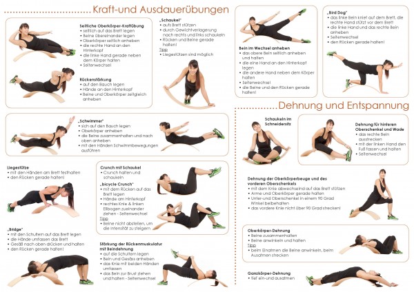 Das.Brett ist extrem stabil und trotzdem flexibel. Es wird dadurch zum Fitnessgerät für alle Altersgruppen. Trainiert werden u.a. Beweglichkeit, Ausdauer, Kraft und Koordination. In der Schaukel stehend können effektive und stabi- lisierende Fitnessübungen durchgeführt werden. Umgedreht ist das.Brett eine ideale Unterlage für verschiedene Gymnastikübungen für die Bauch- , Rücken- , Gesäß- und Beinmuskulatur.