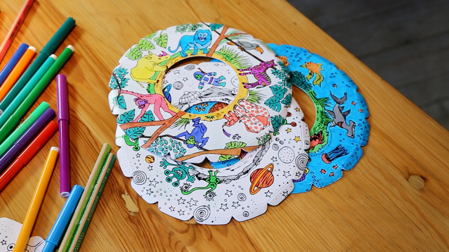 - 3x Indoor-Wurfscheiben (Ø 20cm) mit je einem Motiv (Unterwasser – Safari – Weltraum)