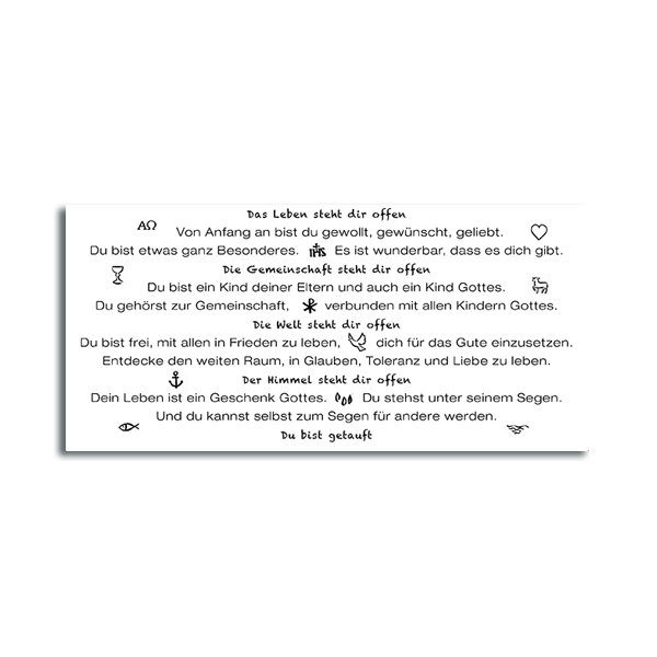 Mit der Taufe wird ein neues Mitglied in die Gemeinschaft der Gläubigen aufgenommen. Schenken Sie einem Täufling mit diesem Wortlicht eine schöne Erinnerung.