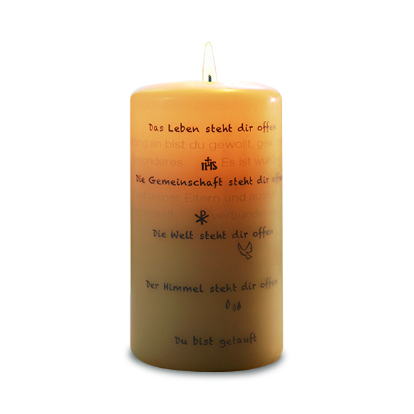 Der gesamte Wortlaut wird sichtbar, wenn die Kerze brennt. Brenndauer ca. 40 Stunden, Gewicht 500 g, Farbe weiß, mit Anleitung verpackt in einer Transparentbox.